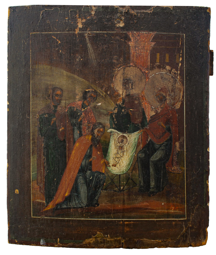 CONDITION: Repaired crack to panel, scattered paint loss, needs cleaning. Sold as is.