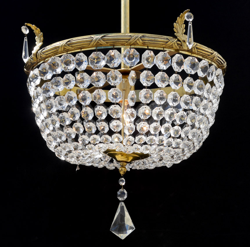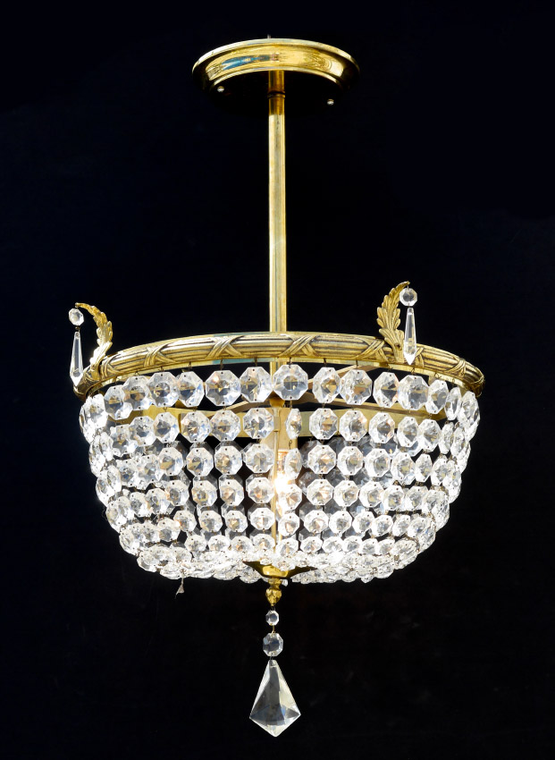 BALDINGER CRYSTAL CHANDELIER: Brass frame with embossed rim, applied leaf decoration. Faceted prism strands, and drops. Overall measures 23'' h. x 19'' dia.