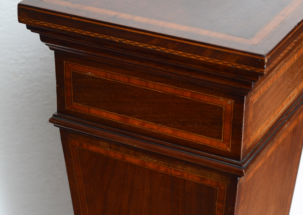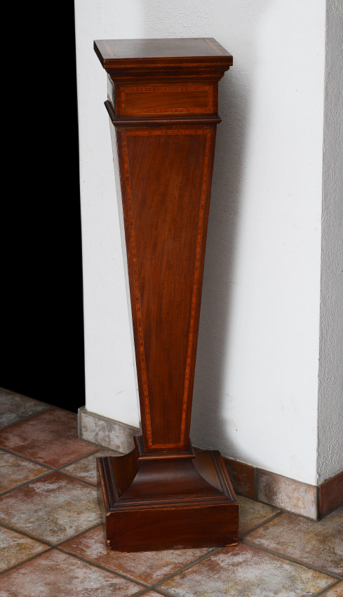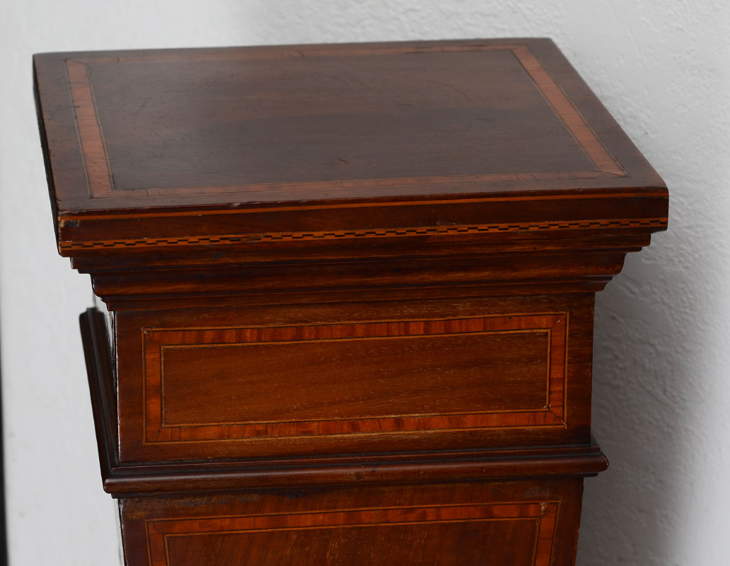 INLAID MAHOGANY PEDESTAL: Banded and parquetry inlay stand measures approx. 45'' tall, the top 10.5 x 10.75.