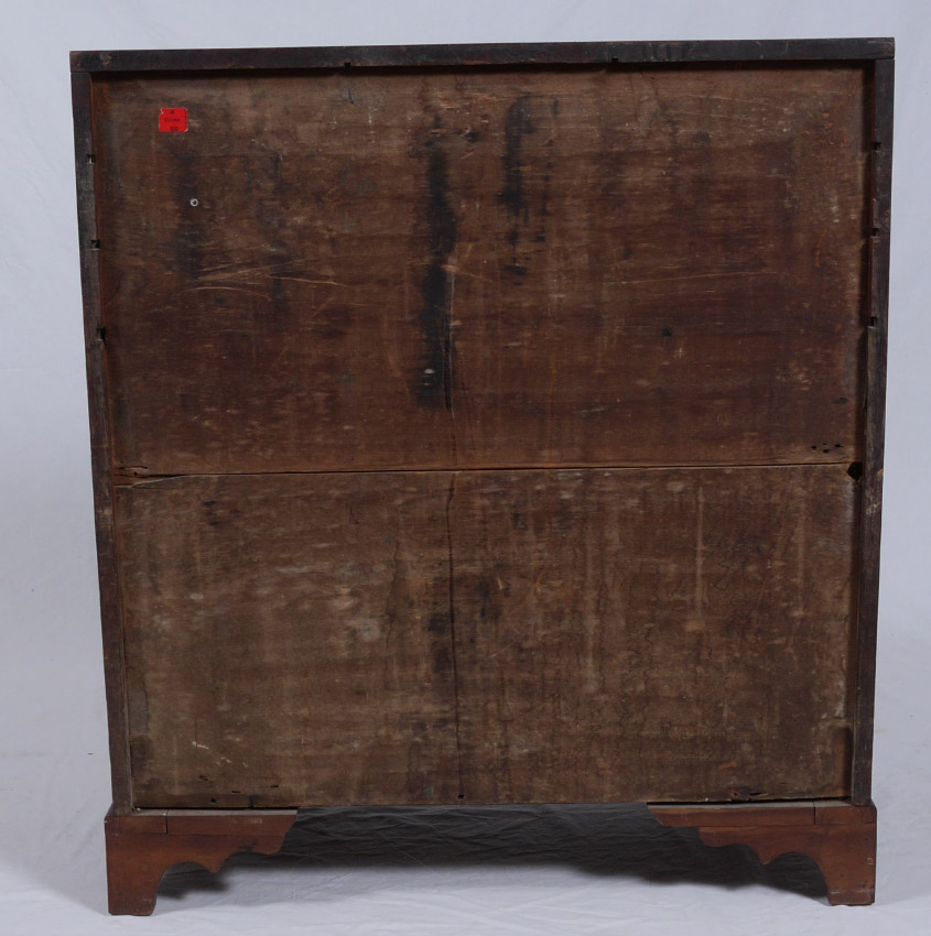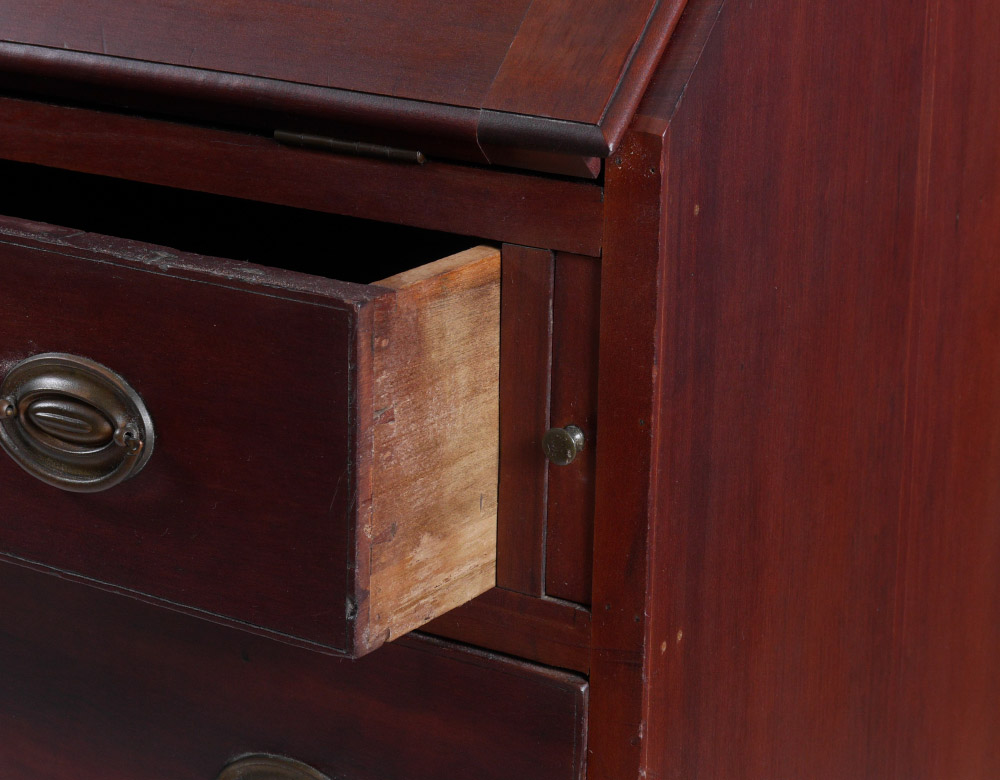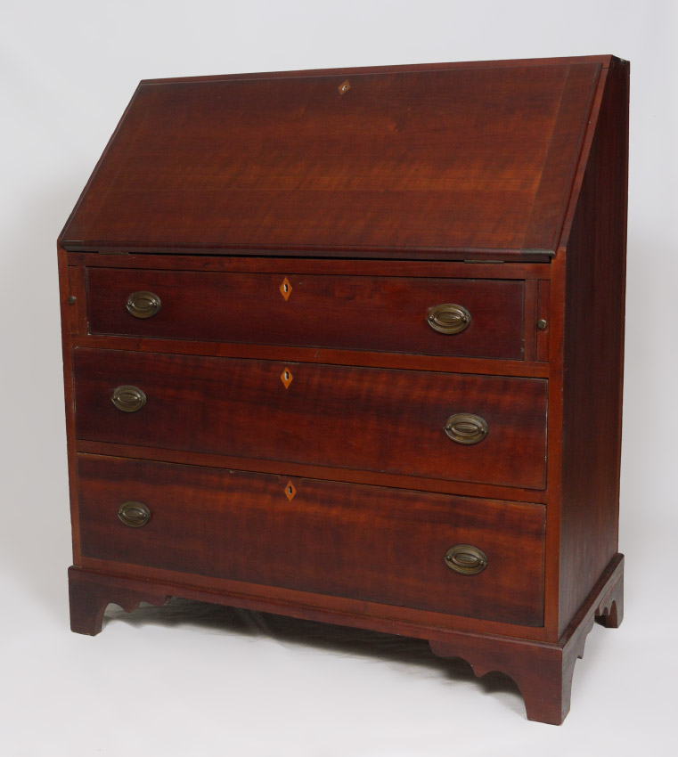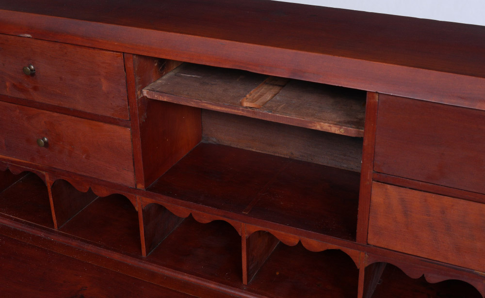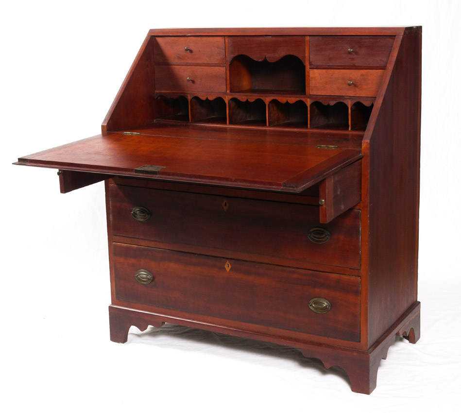 CHERRY SLANT FRONT DESK: Slant front opens to 4 drawers, pigeon holes with shaped valences. 3 graduating full length drawers, bracket feet. Overall measures 42 3/4'' h. x 37 3/4'' x 19 1/2''.