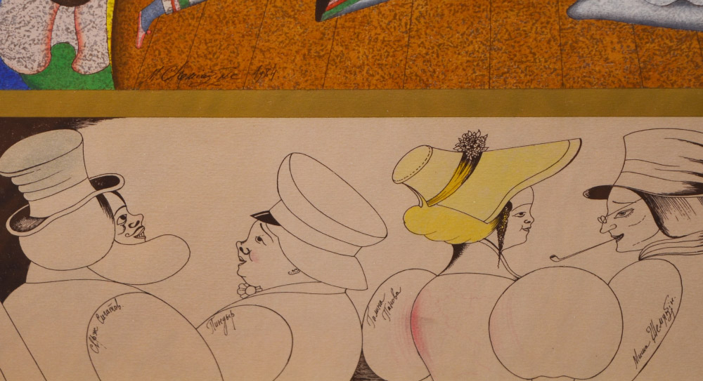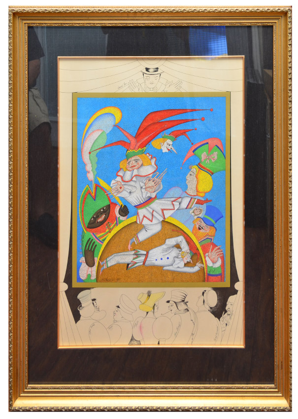 CHEMIAKIN, Mikail, (Russian/American, 1943- ): Harlequin with Stage Actors and Audience, Mixed Media Lithograph/Watercolor Collage, sight size 29'' x 19 3/4'', painting measures approximately 19'' x 16 1/4'', signed lower left and dated 1984, custom frame, 40 1/2'' x 30 1/2''.