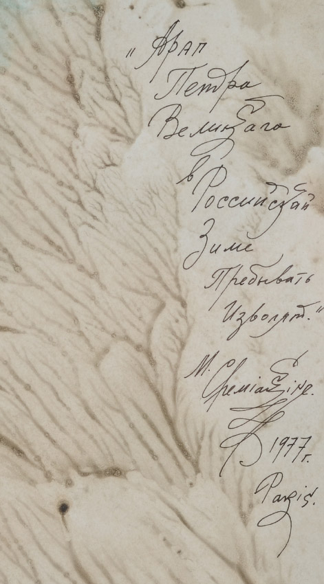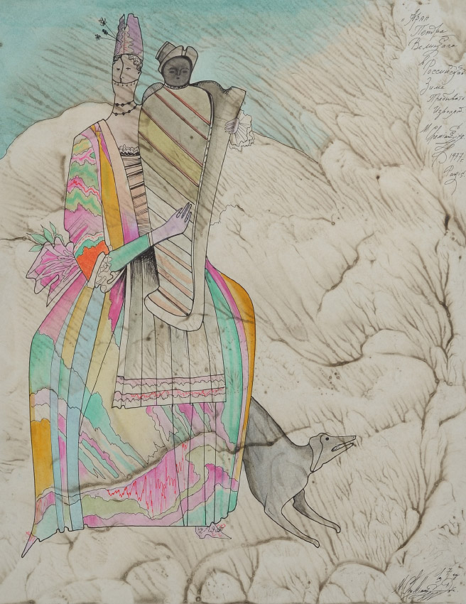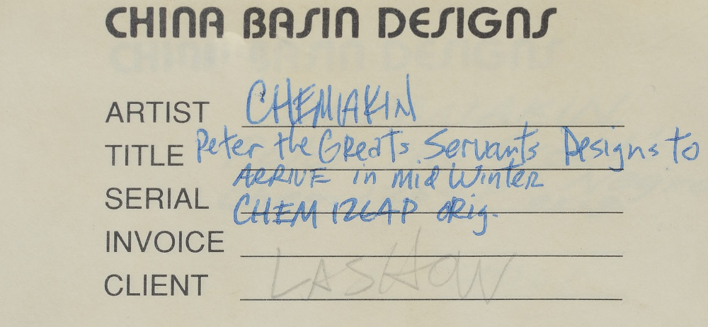 CHEMIAKIN, Mikail, (Russian/American, 1943- ): ''Peter the Great Servants Designed to Arrive in Mid Winter'', Pen/Ink/Watercolor, sight size 12 1/4'' x 9 3/4'', signed lower right and dated 1977, custom black lacquer frame, 28'' x 25''.