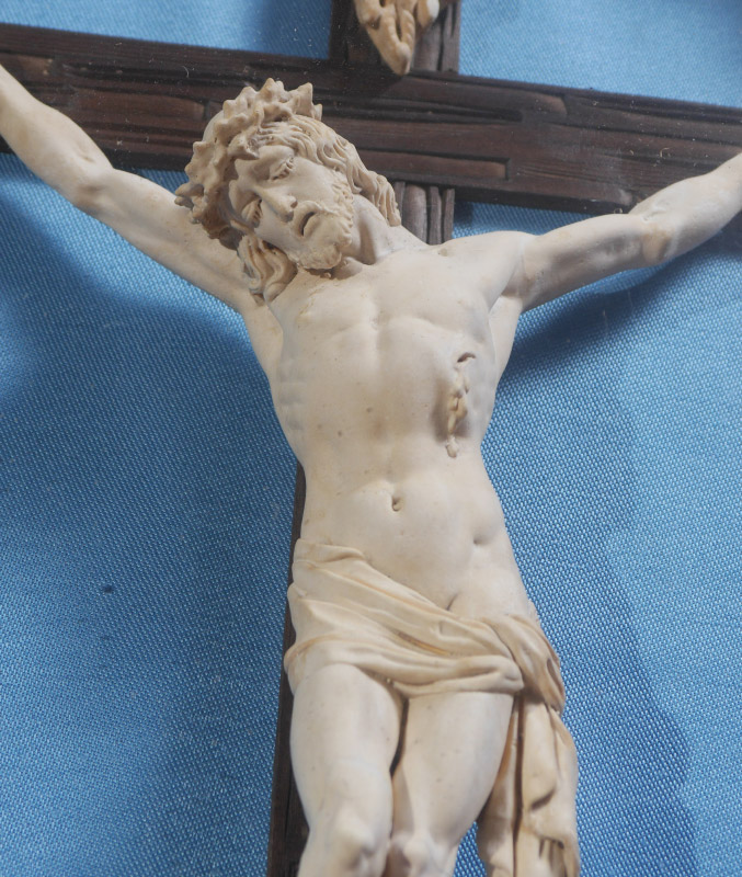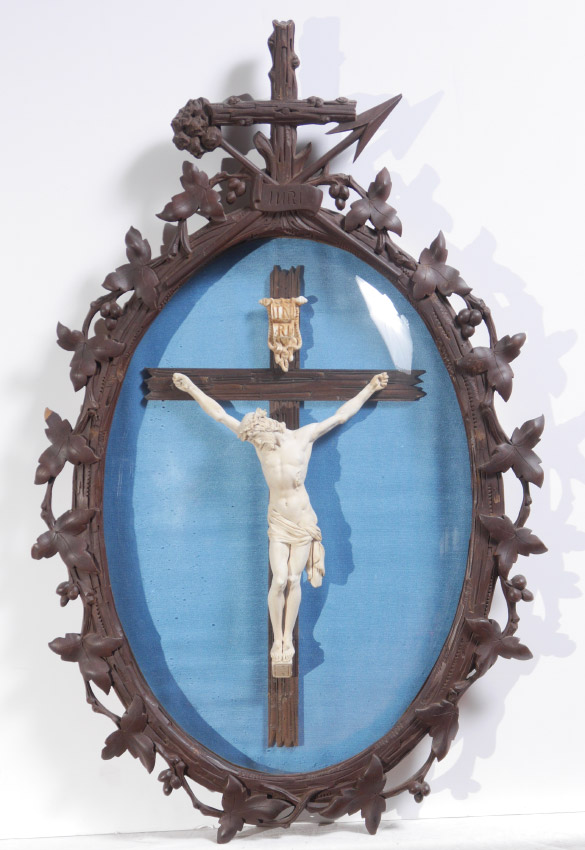CORPUS UNDER CONVEX GLASS IN VICTORIAN FRAME: Nicely detailed ceramic figure of Jesus on the cross with INRI plaque under convex glass. Carved frame with cross finial, oak leaf border, overall 25 3/4'' h. x 16'' x 3''.