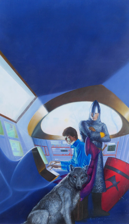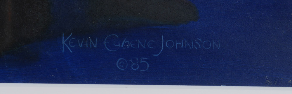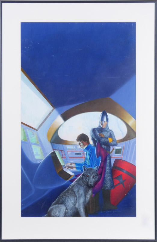 JOHNSON, Kevin Eugene, (American, 1954- ): Medieval Space Travelers, Egg Tempera or Acrylic, sight size 29 1/2'' x 17 1/2'', signed lower right and dated '85, framed, 36 1/2'' x 24''.