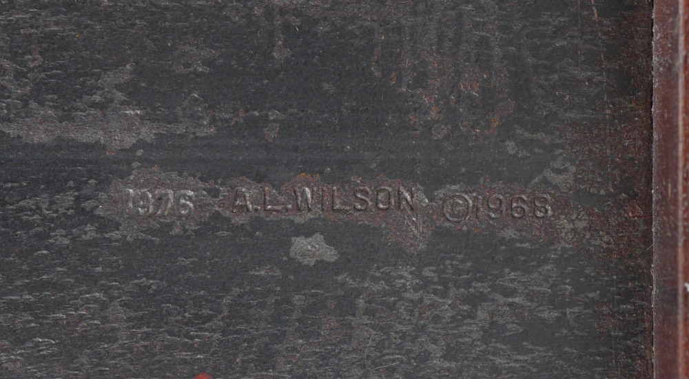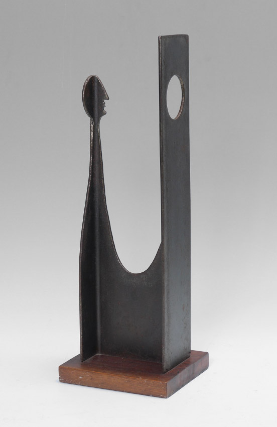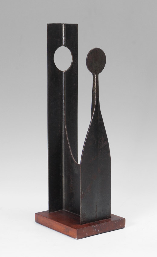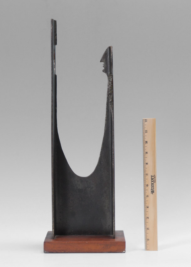 WILSON, Albert Leon, (American, 20th C.): Untitled Abstract Welded Metal Sculpture, 20'' h. x 5 1/2'' w. x 4'' d, stamped signature and dated 1976, affixed to wood plinth, 21 1/2'' overall.