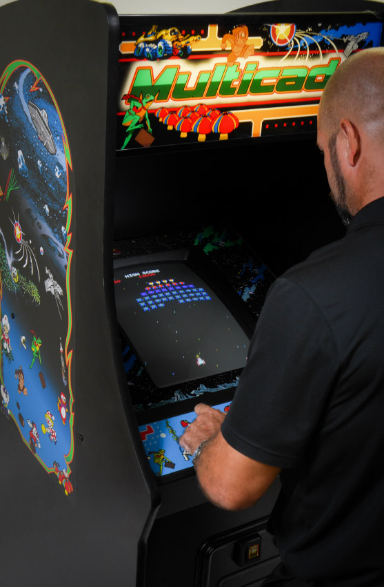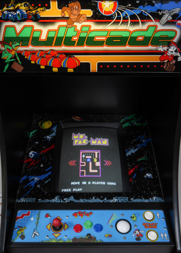 MULTICADE 60 GAME VIDEO ARCADE MACHINE: Play all your favorite 80's classic arcade games on one unit. Game features 60 classic arcade games on a printed circuit board. Games such as Pacman, Ms Pacman, Donkey Kong, Galaga, Burgertime, Centipede, 1942, Gyruss, Digdug and many more. Game features 19'' monitor, track ball and Joystick. Overall measures 68 1/4'' h. x 24 3/4'' x 33 1/4''.