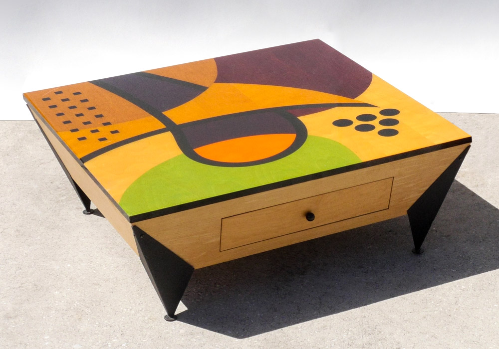 MODERN ITALIAN MARQUETRY INLAID COFFEE TABLE: Square top with abstract design polychrome decoration signed MIR? or WIR?, drawer on 2 sides, metal legs. Overall measures 15 3/4'' h. x 41'' x 41''.