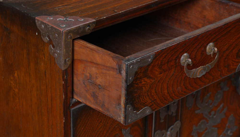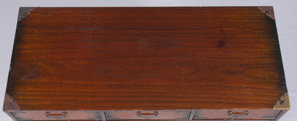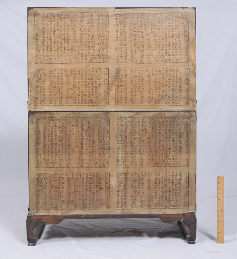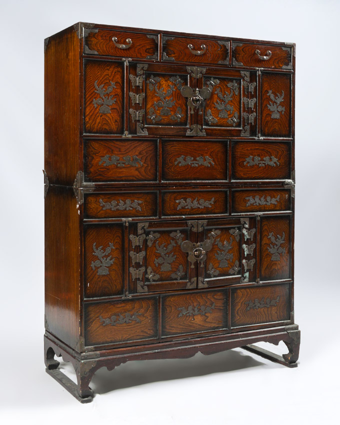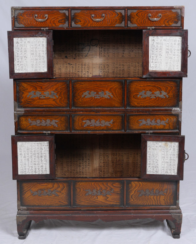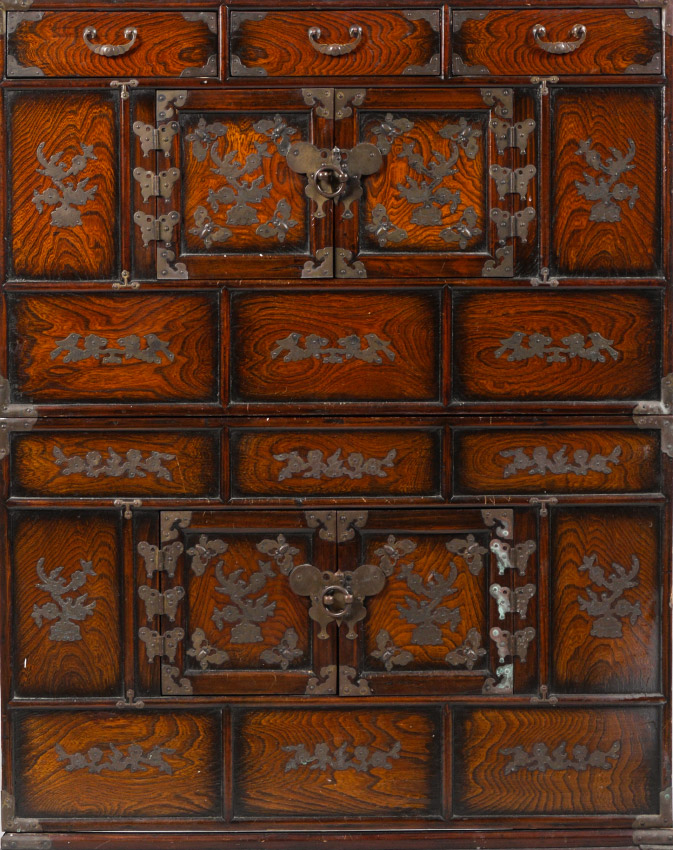 KOREAN 2 PART TANSU CABINET ON STAND: 3 pieces total, top section with 3 drawers over 2 doors with open storage, middle section with 2 doors open storage, carved wood stand. Applied metal decoration on front panels and corners, interiors lined with paper. Top 2 sections measures 18 1/4'' h. x 29 3/4'' x 12 1/4'' each, overall 69'' h.