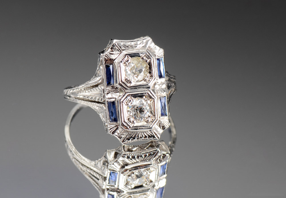18K ART DECO DIAMOND RING: 18K white gold filigree ring with two old European round cut diamonds totaling approx. .50 Ct., rated VS in clarity and H-I in color. One diamond has a small chip. Four rectangle shaped synthetic sapphires are bezel set. The diamonds are prong set. Weight: 3.9 grams. Size: 7.5 .