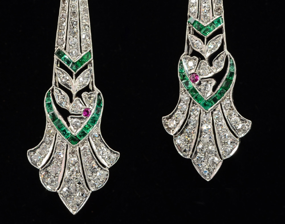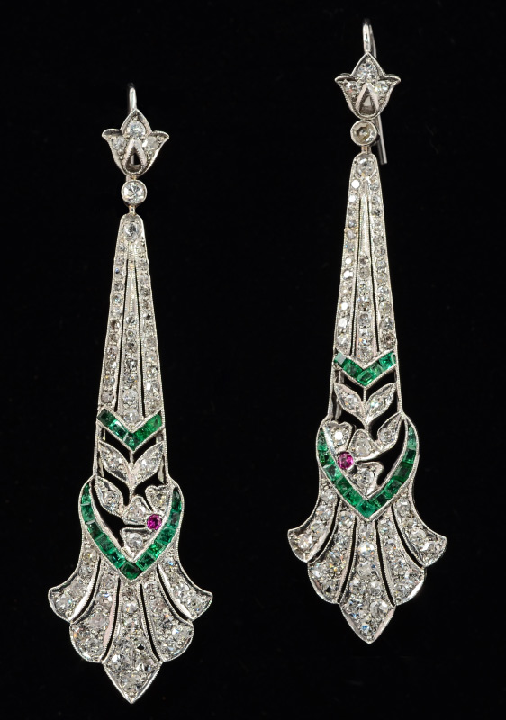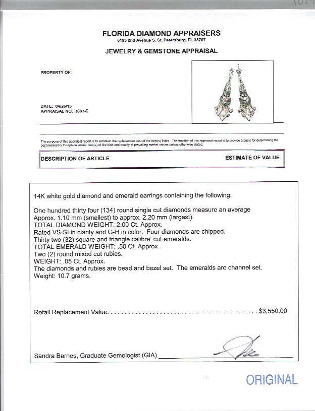 ART DECO STYLE EMERALD AND DIAMOND EARRINGS: 14K white gold filigree earrings, diamonds totaling approx. 2.00 Ct, rated VS-SI clarity and G-H color. The emeralds total approx. .50 Ct.. Each earring has a single accent ruby. Wire hook closure findings. Length 2.5''. Weight 10.7 grams. Sold with current Florida Diamond Appraisers GIA graduates appraisal for $3550.