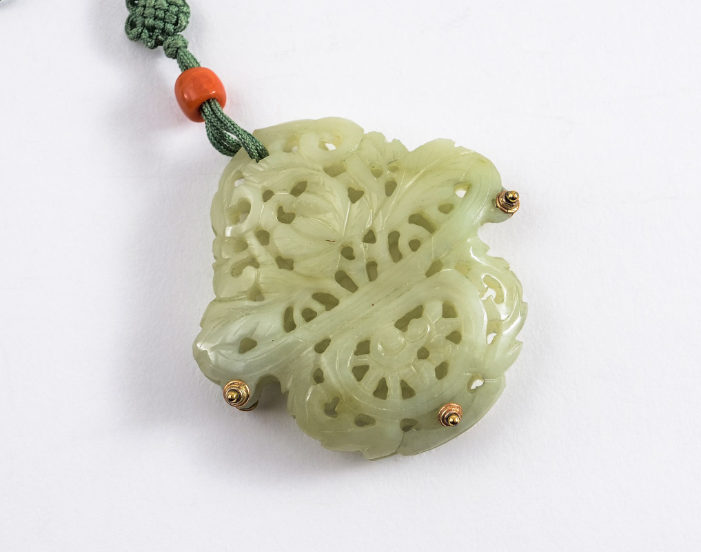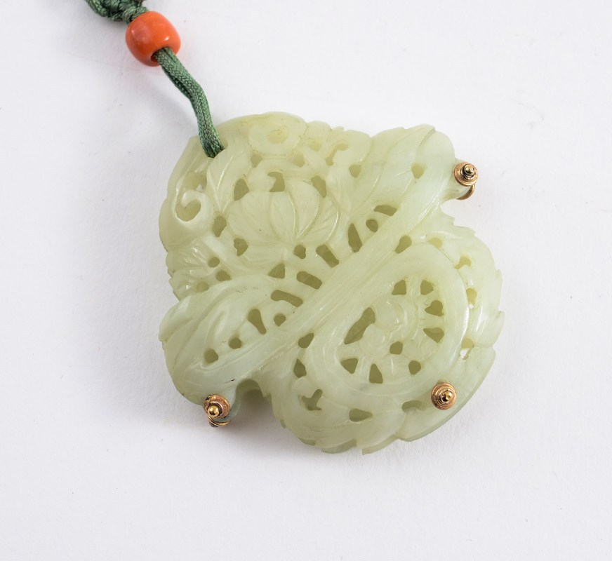 CARVED RETICULATED CHINESE JADE PENDANT: Pierced carved hard stone, most likely jade, either side with floral motifs, hollow center, pegged together at sides and base. Overall measures 2 1/4'' x 2 1/4'' x 1 1/4''. Sold with a box, 1 1/4'' h. x 4'' x 2 3/4''.