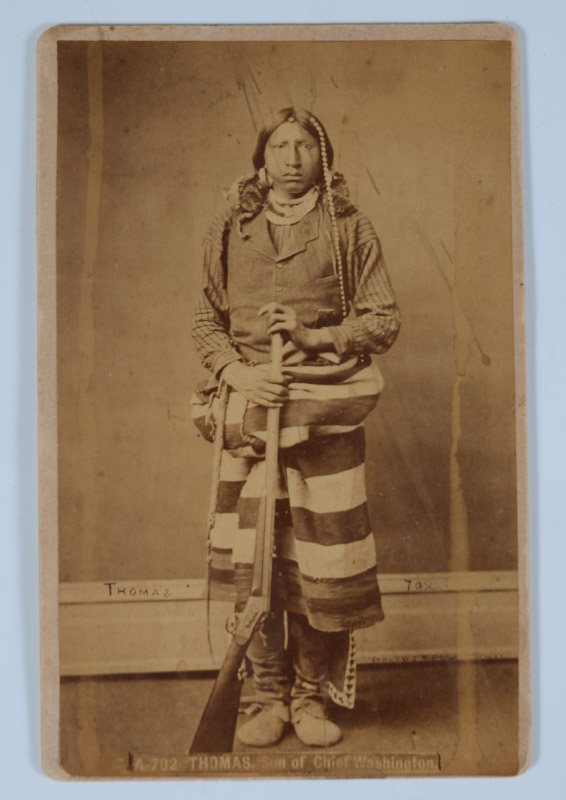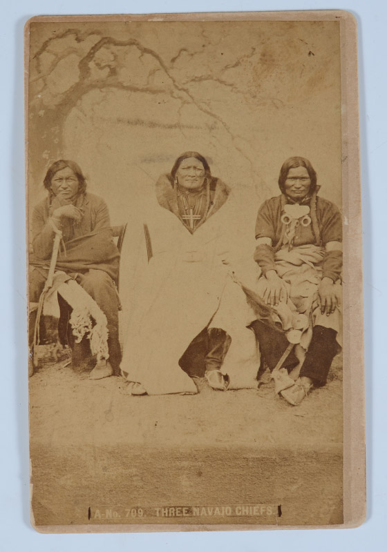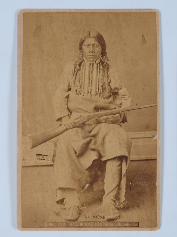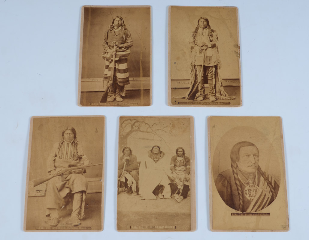 5 NATIVE AMERICAN ALBUMEN CABINET PHOTOGRAPHS: Collection of 5 assorted albumen cabinet photos of Native Americans, each numbered on the front with hand written notes in the plate, some noting H. Hawkins of Denver, not marked on back, to include 1) A-No. 701, PI-HA, Chief of the Piutes. 2) A-702, THOMAS, Son of Chief Washington. 3) A-No. 703, UNCA Arapaho Chief. 4) A-No. 708. UTE MOON, Ute Indian Brave. 5) A-No. 709. Three Navajo Chiefs. Each photo 7'' x 4 1/2''.