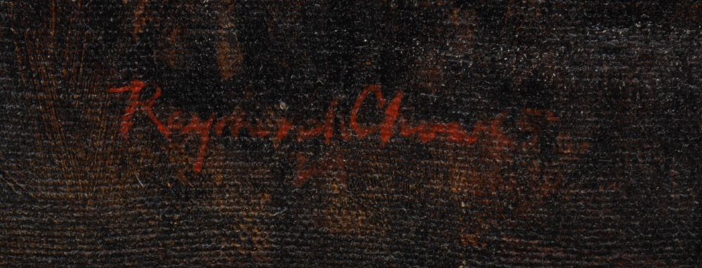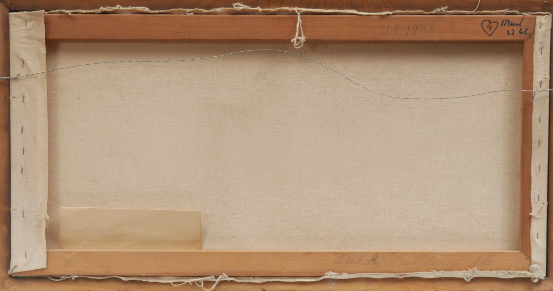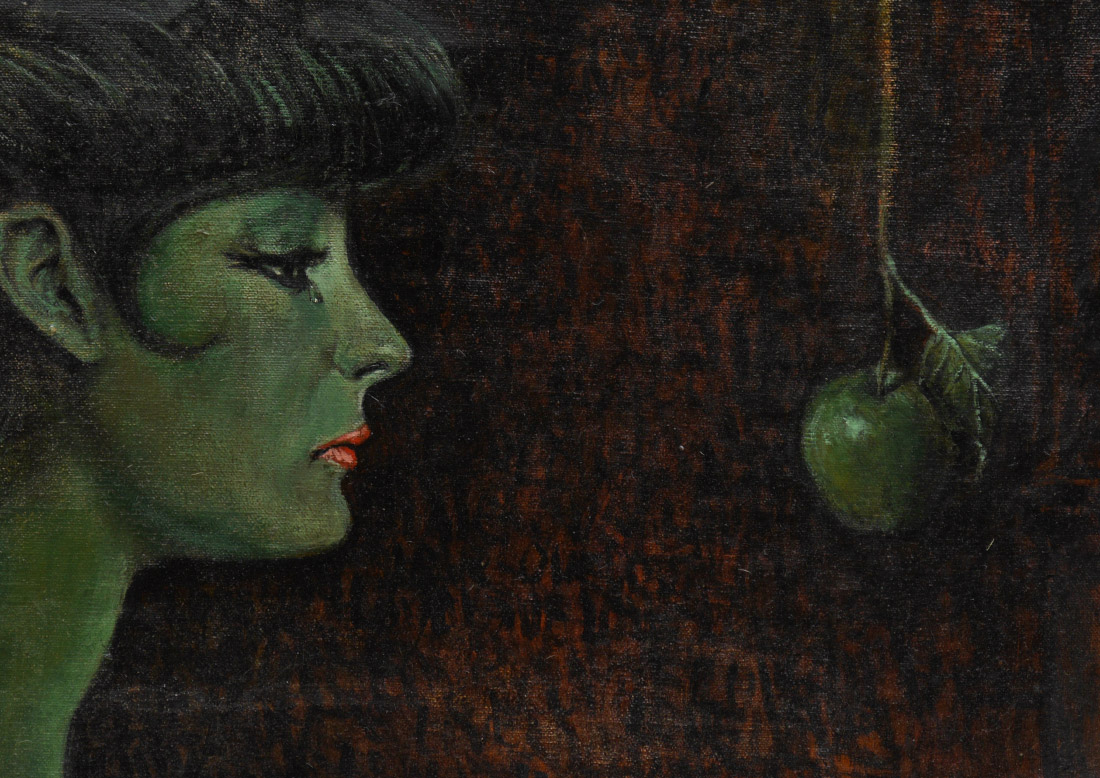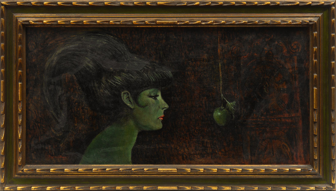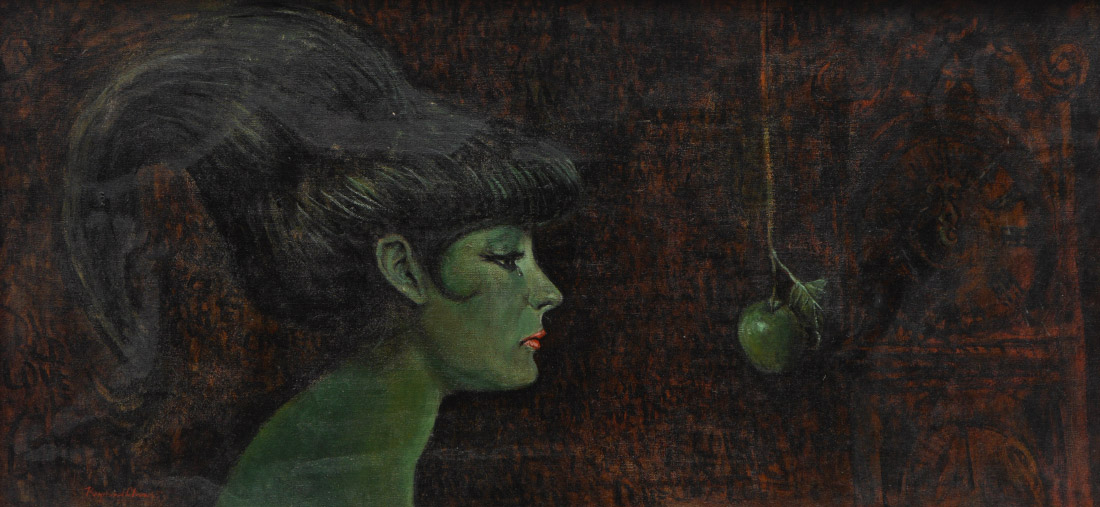 CHOW, Raymond, (Canadian, 1941- ): Interior scene with a young brunette beauty with a tear in her eye gazing at suspended apple, Oil/Canvas, sight size 15 1/2'' x 32'', inscribed on the stretcher Dutch Gallery Number 16, also a label which reads Dutch Gallery 16, carved wood frame, 21 1/4'' x 37 1/2'', included with the picture is an invitation from Dutch Gallery for an exhibition of recent works of noted painters Gordon Alexander and Raymond Chow on January 28, 1966. Dutch Gallery was located in Vancouver, British Columbia, Canada.