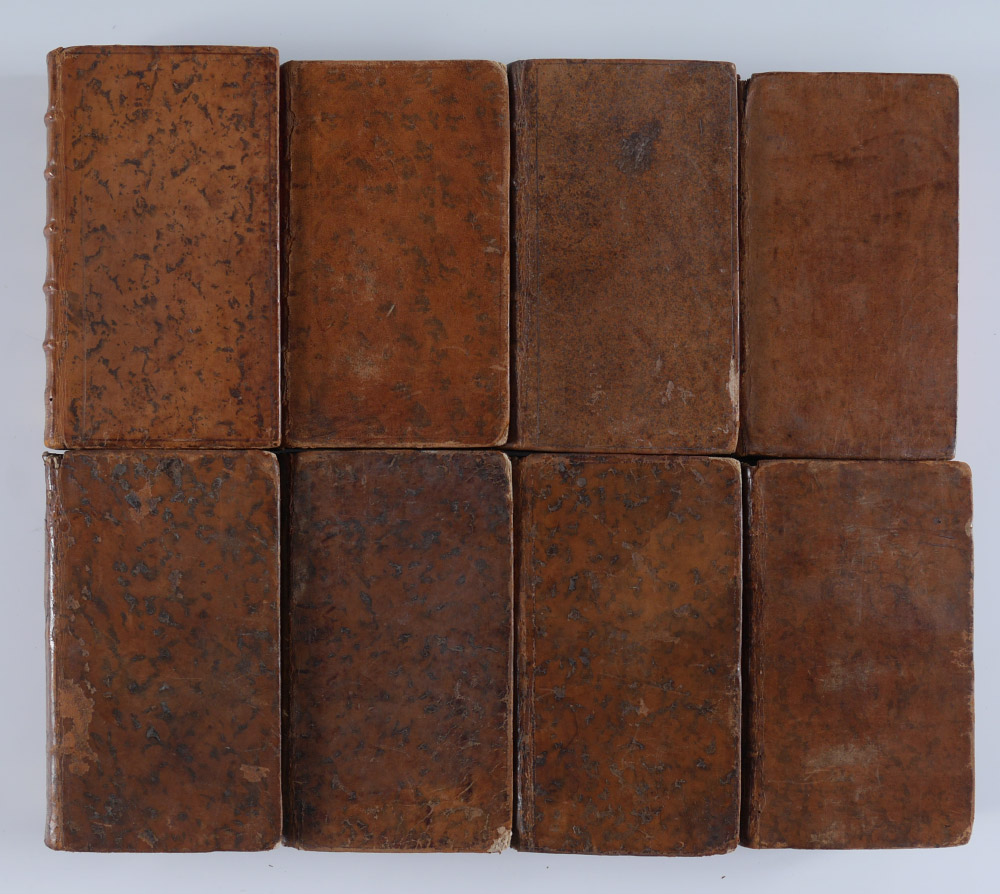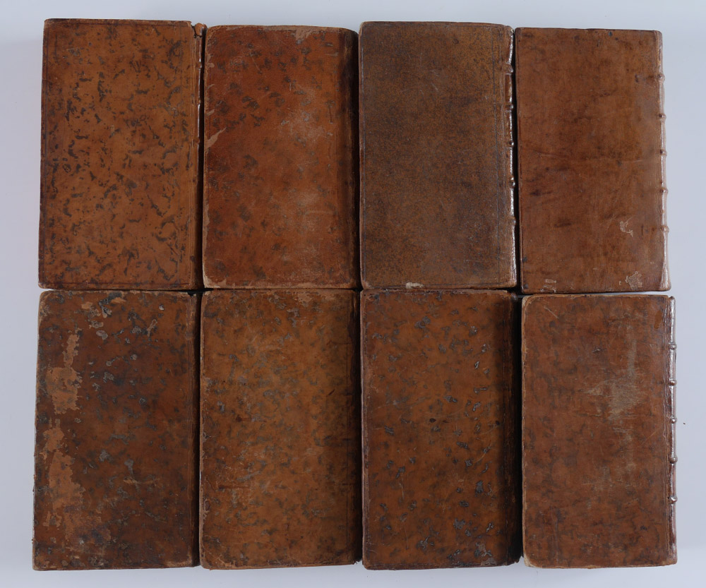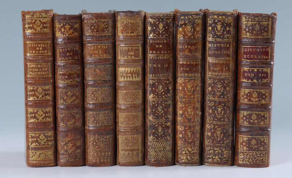 8 VOLUMES ANTIQUARIAN HISTORY LEATHER BOUND BOOKS: 8 assorted volumes each with embossed leather spines, titles to include 1) ''Abrege de L'Histoire Ecclesiastique'', volume 7, 1754, Cologne. 2) ''Historie Romaine Depuis La Fondation de Rome'', volume 10, 1758, Paris. 3) ''Historie Romaine Depuis La Fondation de Rome'', volume 2, 1748, Paris. 4) ''Historie de France'', 1754, Paris. 5) ''Historie de France'', volume 25, 1778, Paris. 6) ''Historie de France'', volume 3, 1762, Paris. 7) ''Historie de L'Eglise en Abrege'', volume 3, 1719, Paris. 8) ''Historie du Ciel'', volume 2, 1748, Paris.