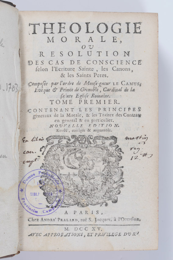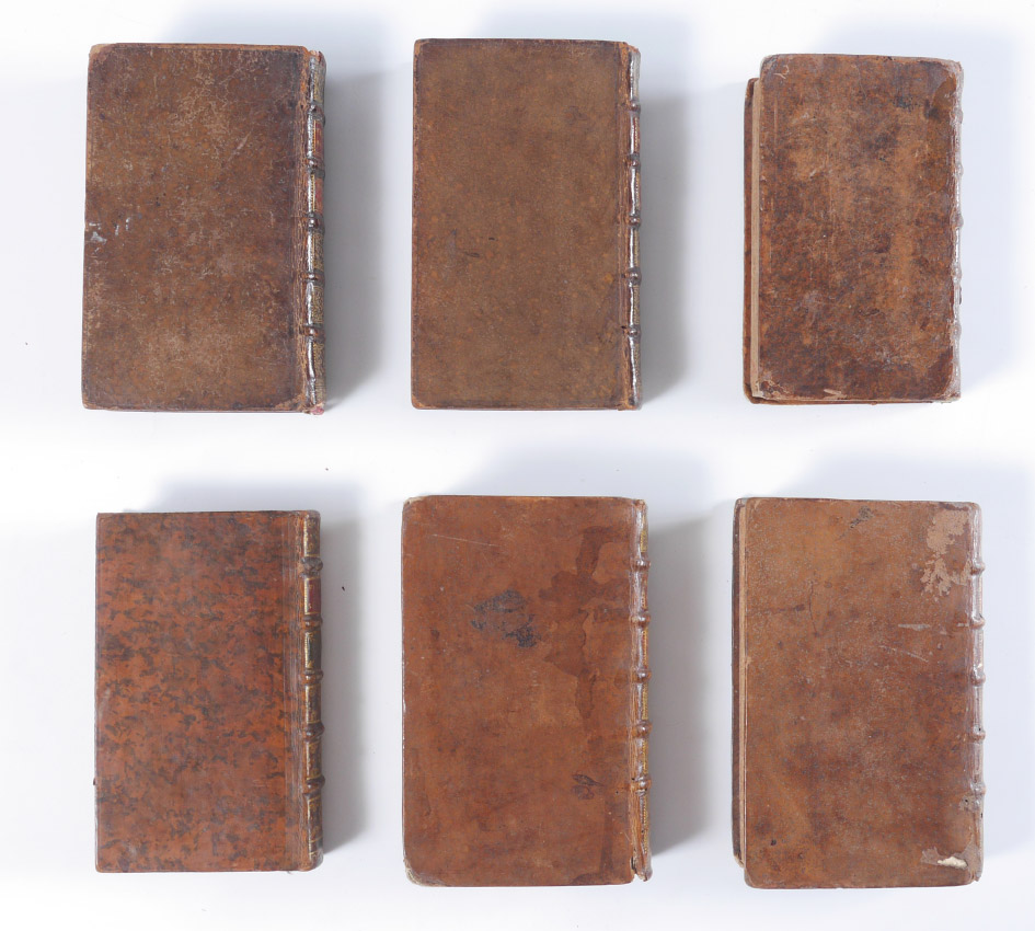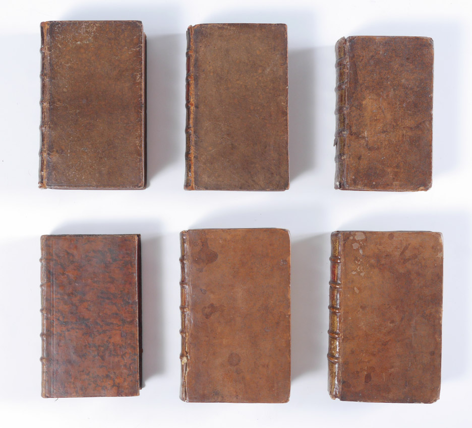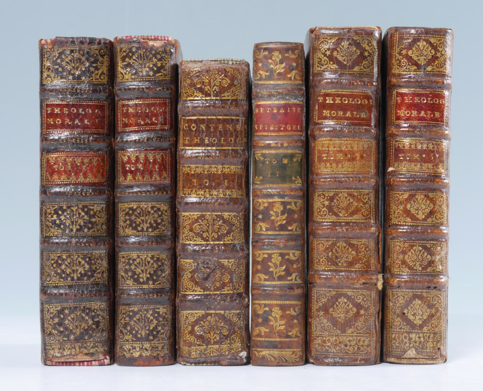6 VOLUMES ANTIQUARIAN THEOLOGICAL LEATHER BOUND BOOKS: 8 assorted volumes each with embossed leather spines with raised bands, titles to include 1) ''Theologie Morale'', volume 1, 1715, Paris. 2) ''Theologie Morale'', volume 2, 1715, Paris. 3) ''Theologie Morale'', volume 3, 1708, Paris. 4) ''Theologie Morale'', volume 5, 1708, Paris. 5) ''Theolgia Mentis et Cordis'', volume 1, 1681, Lugduni. 6) ''Retraite Spirituelle Pour Un Jour de Chaque Mois'', volume 2, 1732, Paris.