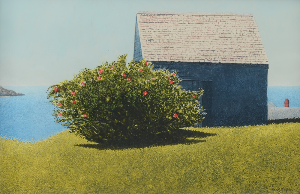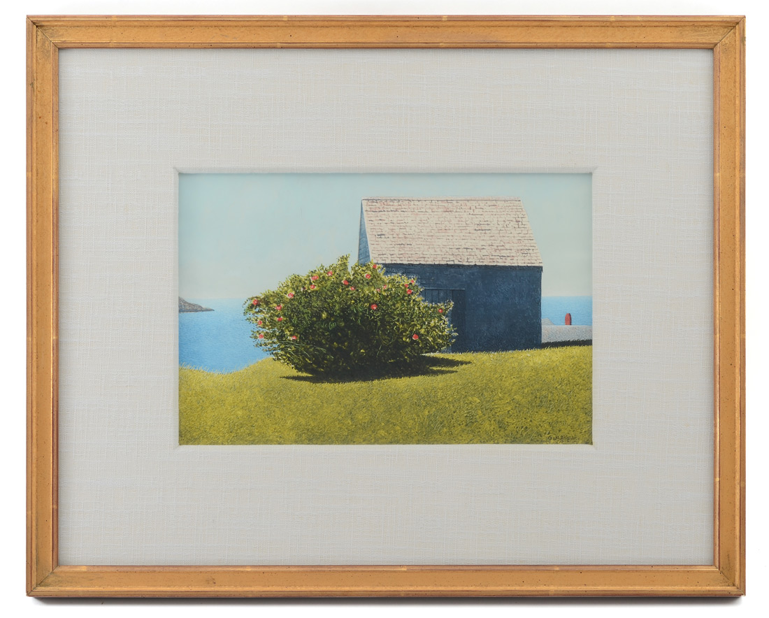 AKERS, Gary, (American, 1951- ): Maine Shore Scene with Flowering Bush and Shed, Watercolor/Gouache/Paper, sight size 8 1/2'' x 13'', signed lower right, custom linen mat, framed under glass, 18 1/4'' x 22 3/4''.