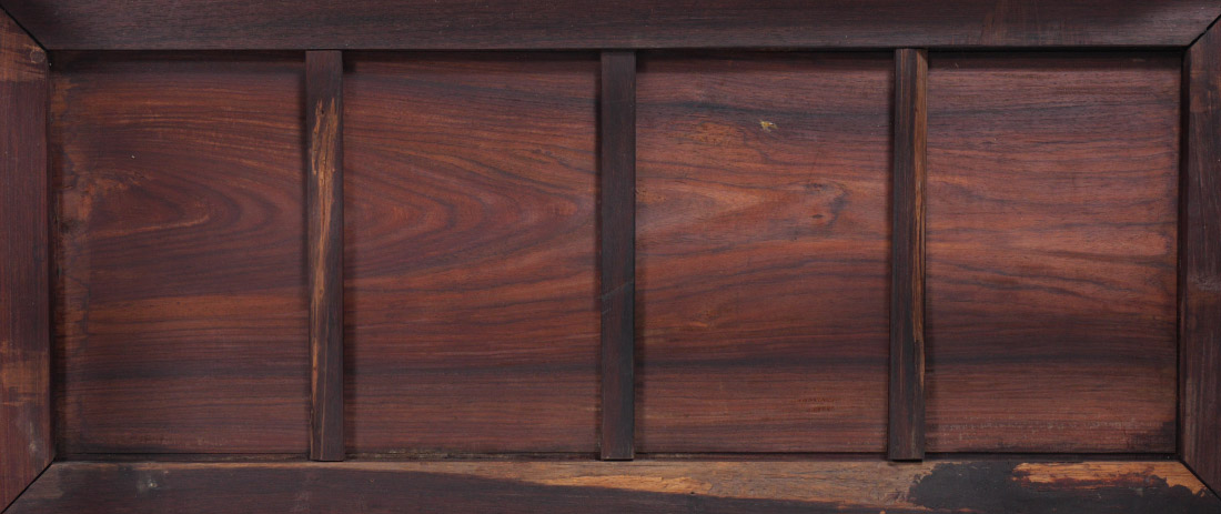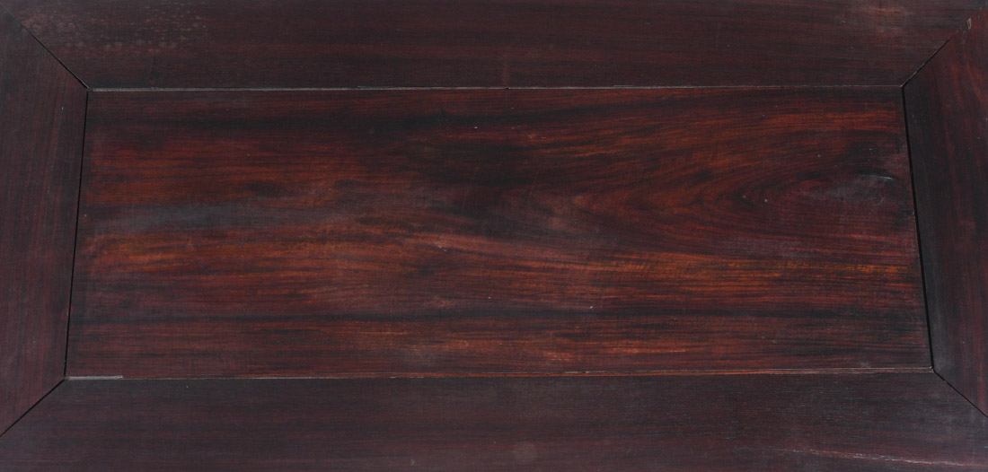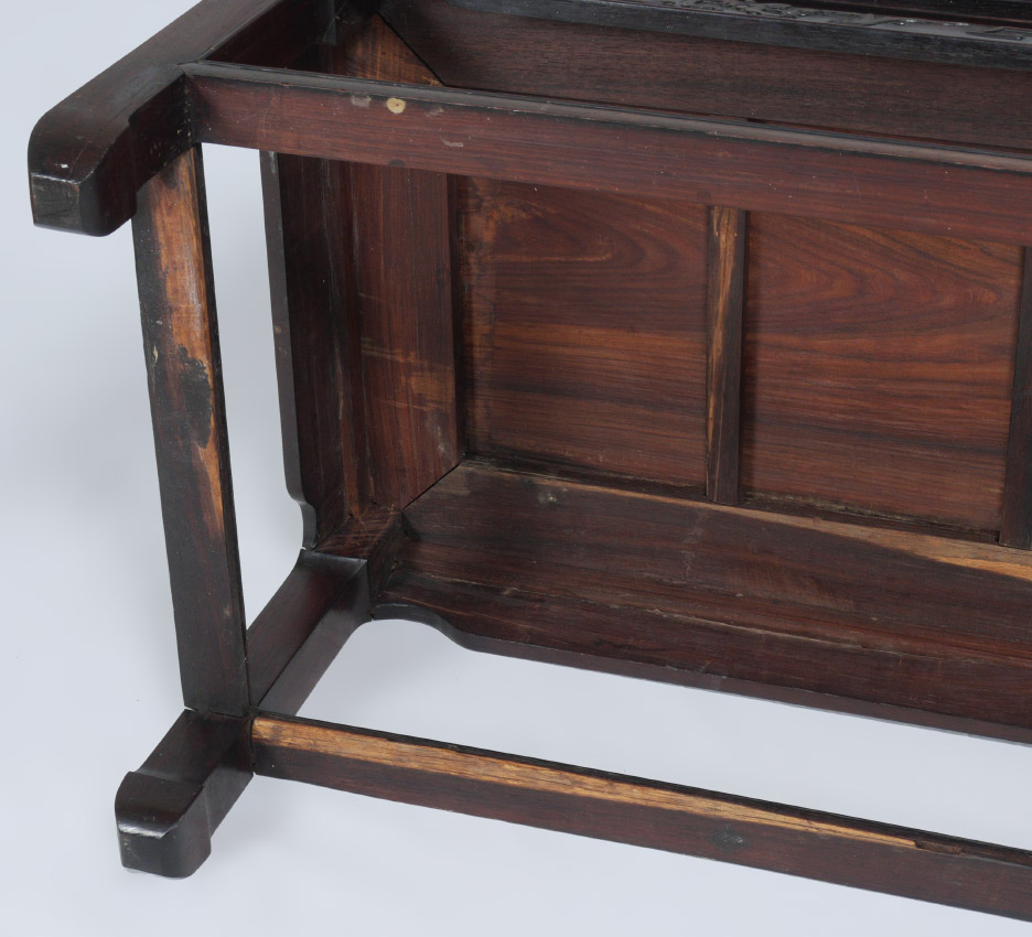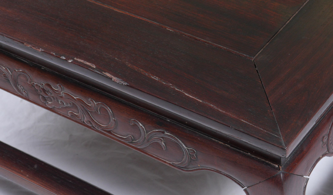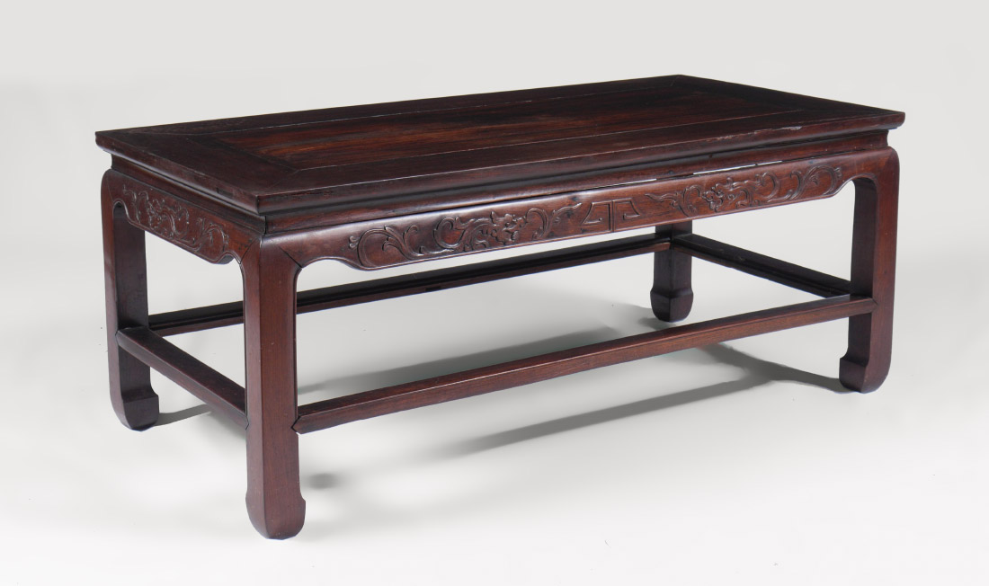 CHINESE CARVED ROSEWOOD COFFEE TABLE: Shaped skirt with carved dragon motifs, lower stretcher, shaped feet. Overall 18'' h. x 43 1/2'' x 21 3/4''. Former property of a US Foreign Service Officer living in Post-War China (1945-).