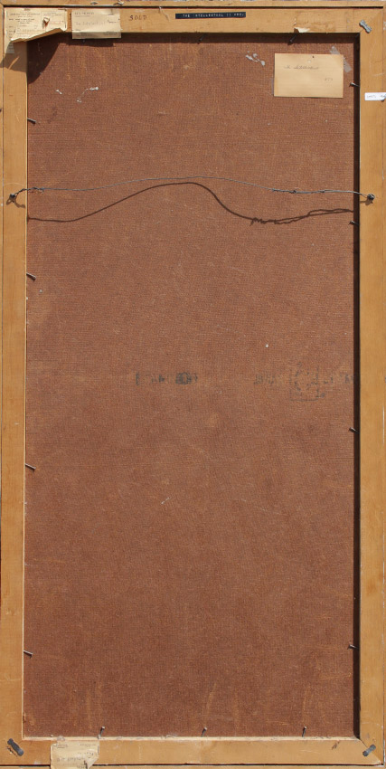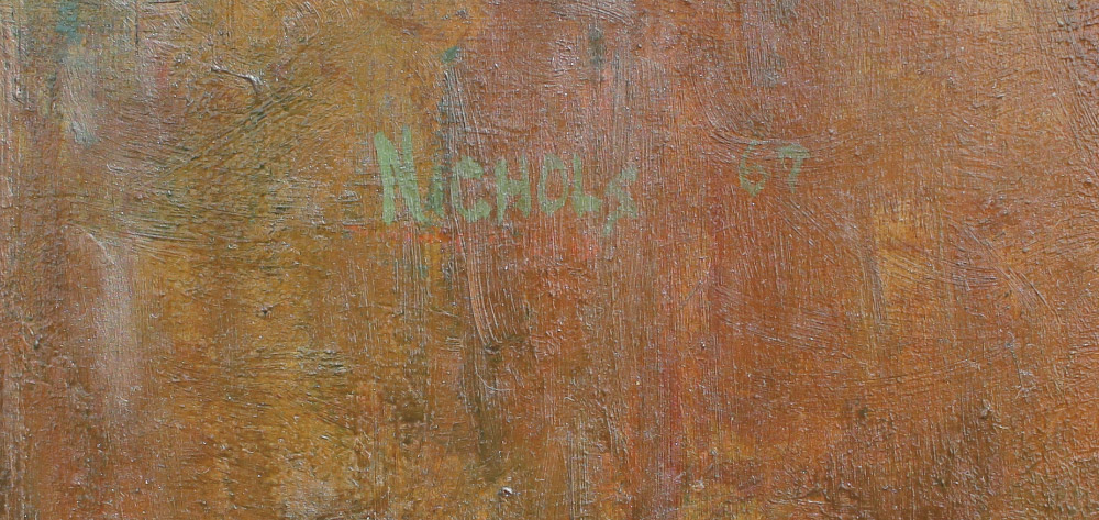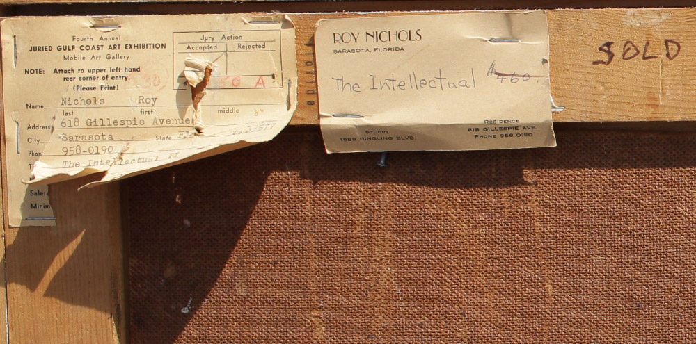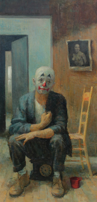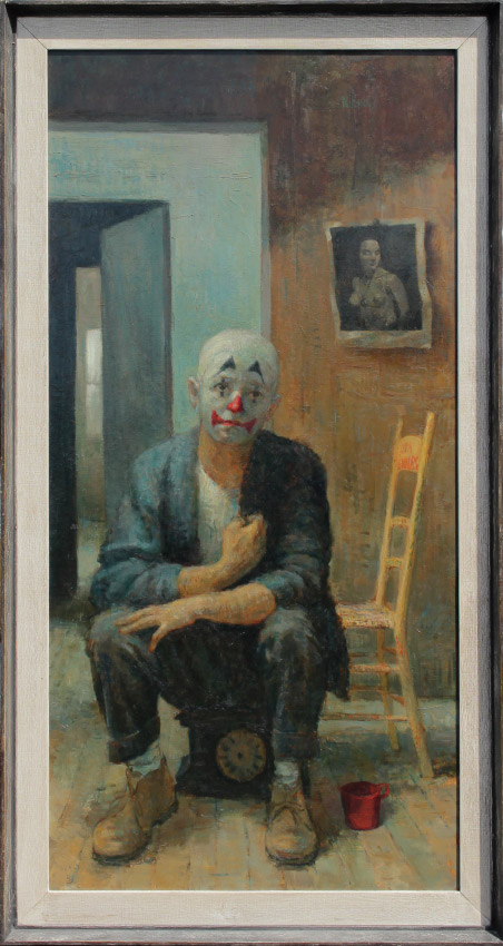 NICHOLS, Roy, (American, 20th Century): ''The Intellectual II'', Depicts a Seated Clown in His Dressing Room Interior with a Nude Pinup in the Background, Oil/Masonite, sight size 48'' x 24'', signed upper right, Gulf Coast Art Exhibition label affixed verso, original artist's studio label and original index card with title affixed verso, painted barn wood style frame, 52 1/2'' x 28 1/4''.