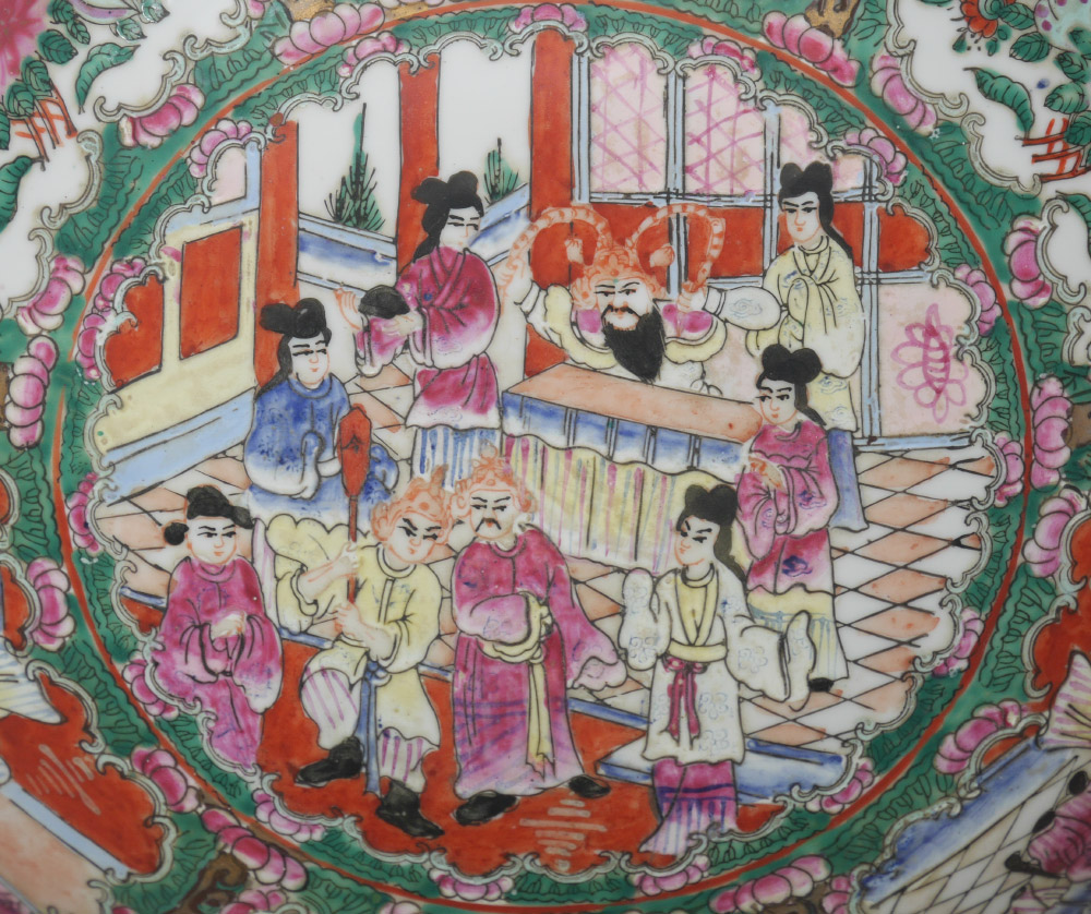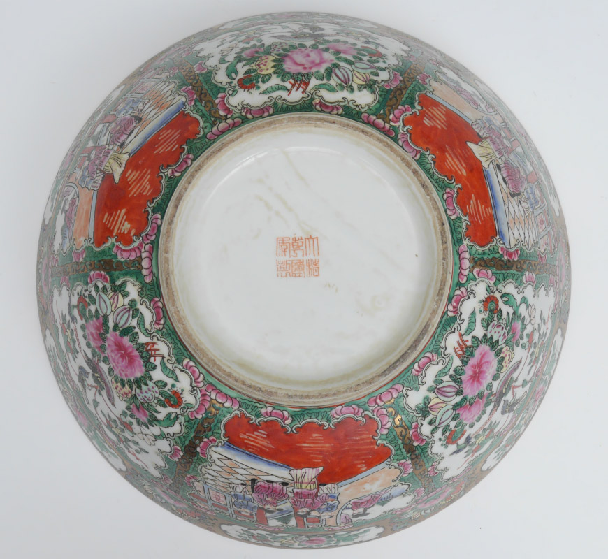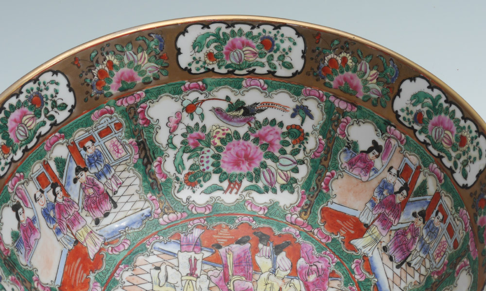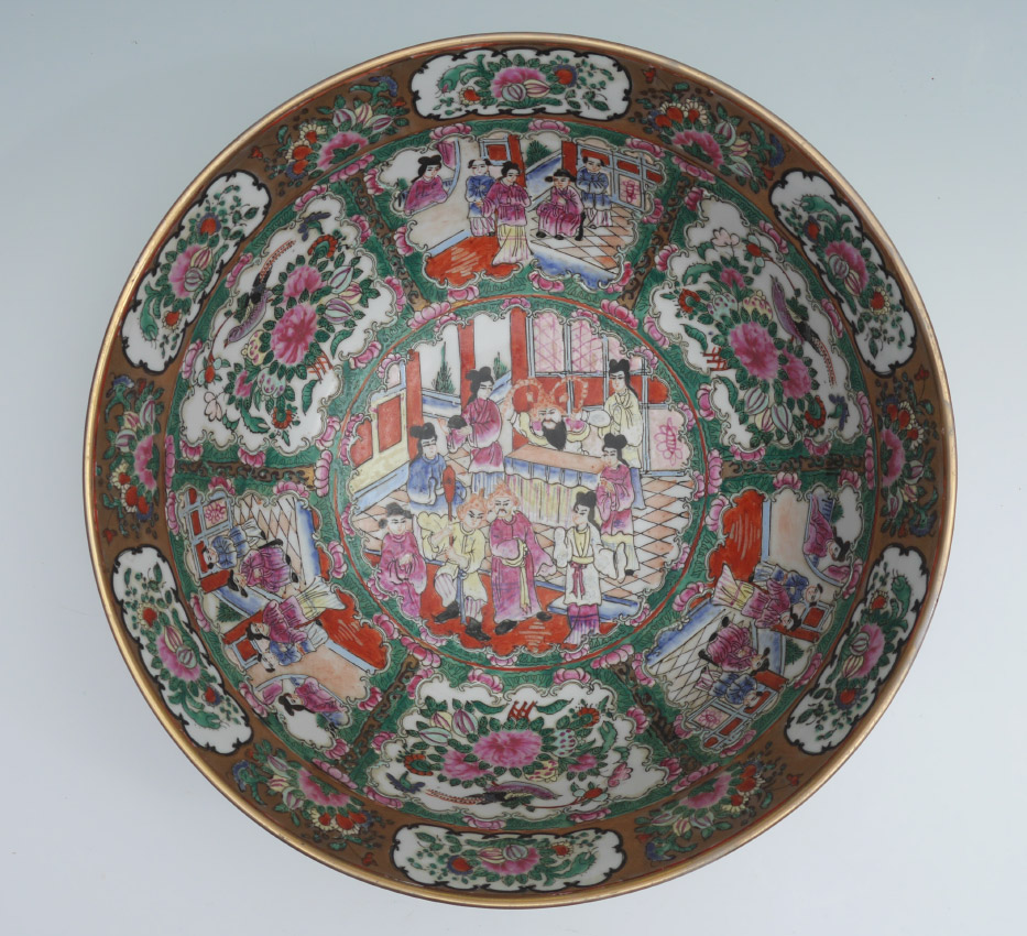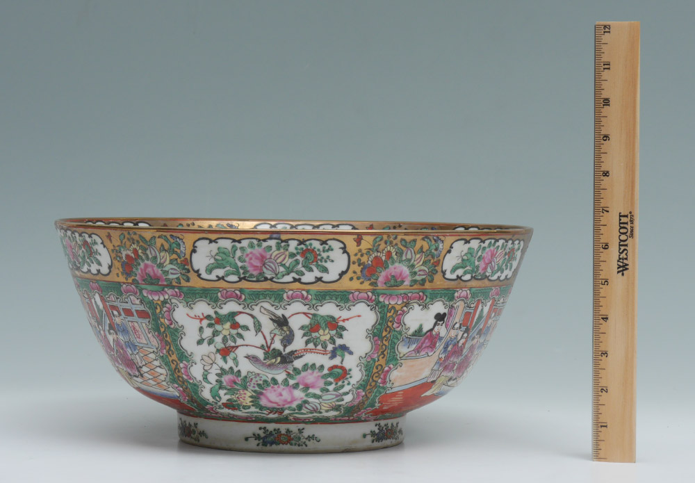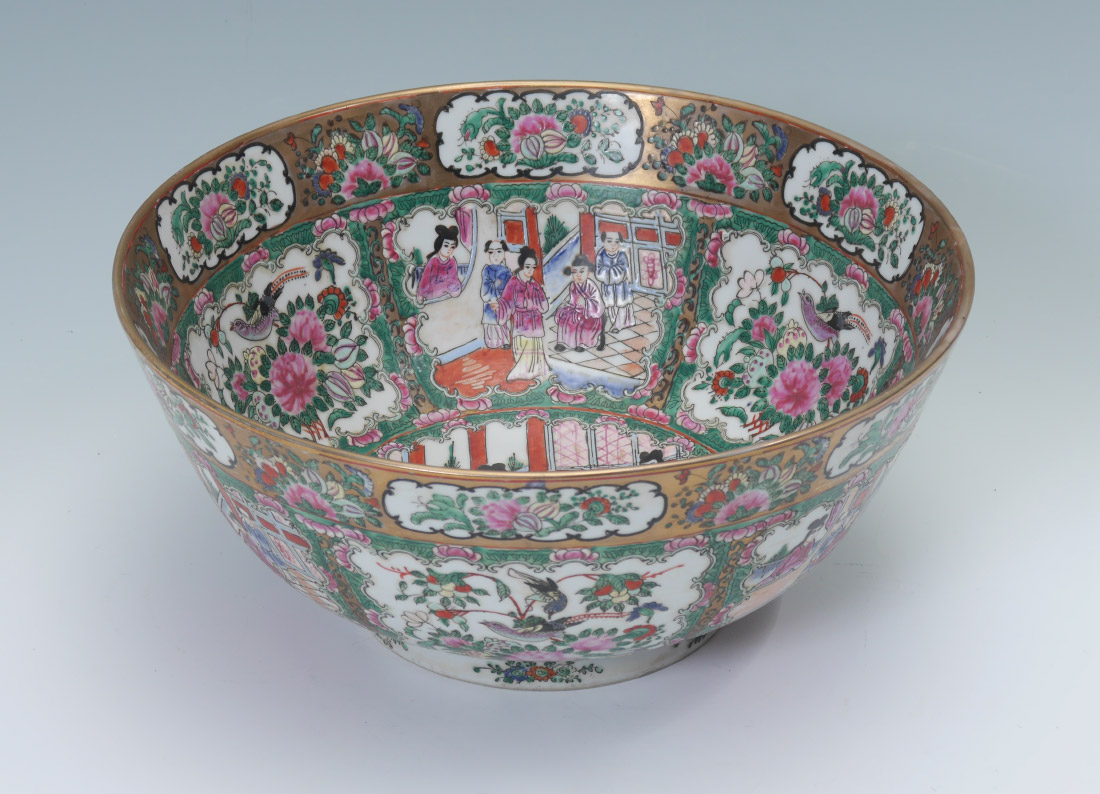 QING DYNASTY ROSE MEDALLION PUNCH BOWL: Gilt border with floral motif panels over alternating interior genre scene and flowers with bird panels, center with scene of actors. Marked on base with 6 character Qianlong mark. Overall measures 6 1/2'' h. x 14 1/4''. Actual age unknown. Former property of a US Foreign Service Officer living in Post-War China (1945-).