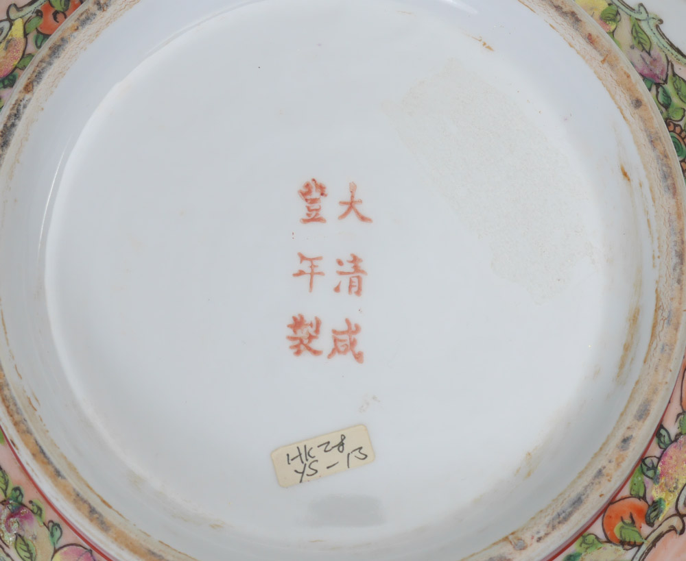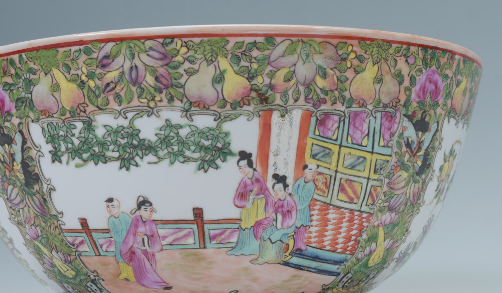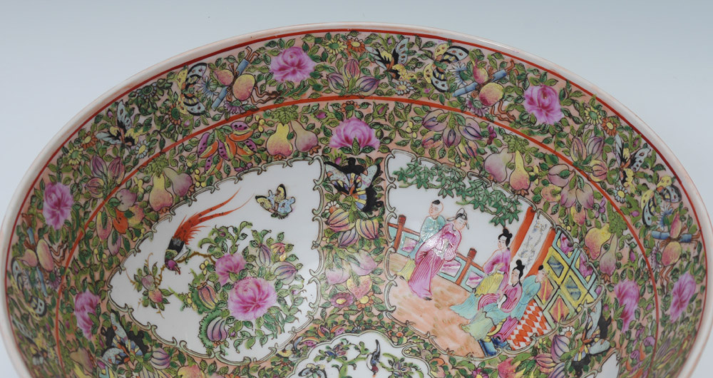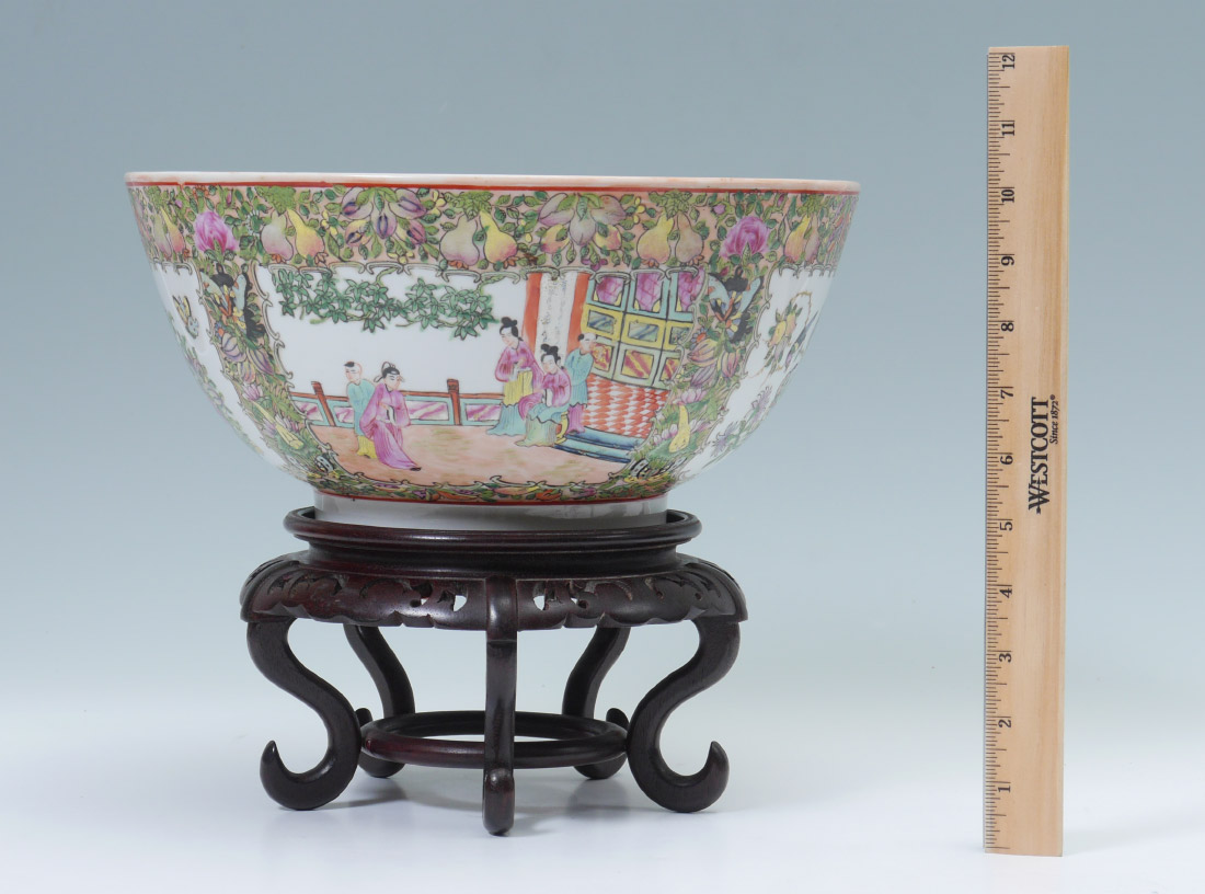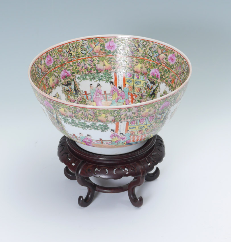 QING DYNASTY ROSE MEDALLION PUNCH BOWL ON STAND: Flowers, fruit and butterfly borders with alternating genre scenes and bird with flowers panels. Red Xianfeng mark on base, overall measures 5 3/4'' h. x 12''. Sold with carved wood base, 4 3/4'' h. x 8 1/2'' dia. Former property of a US Foreign Service Officer living in Post-War China (1945-).