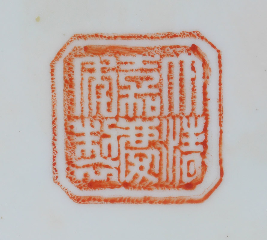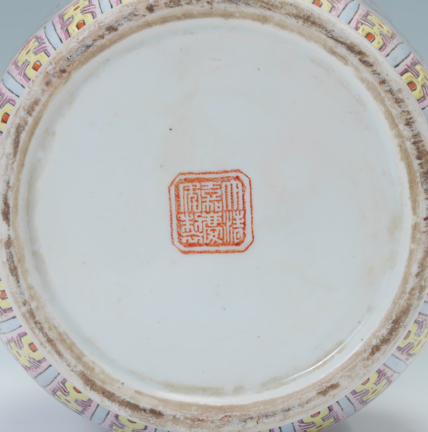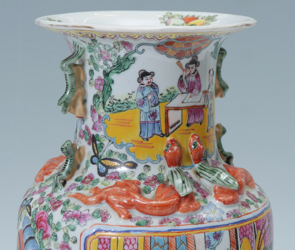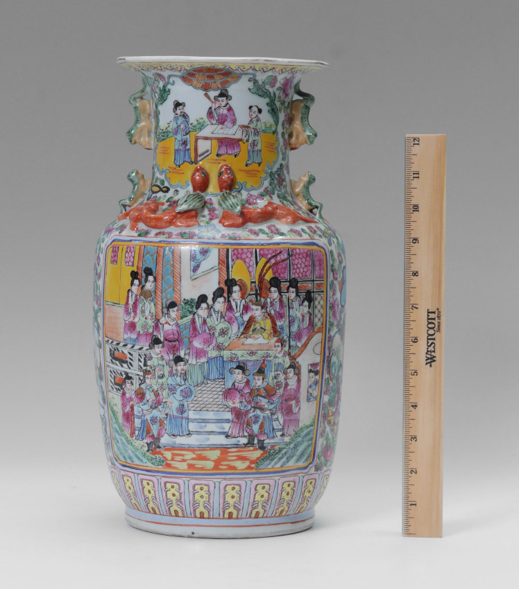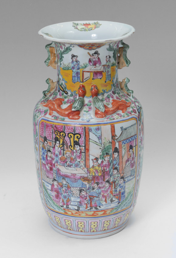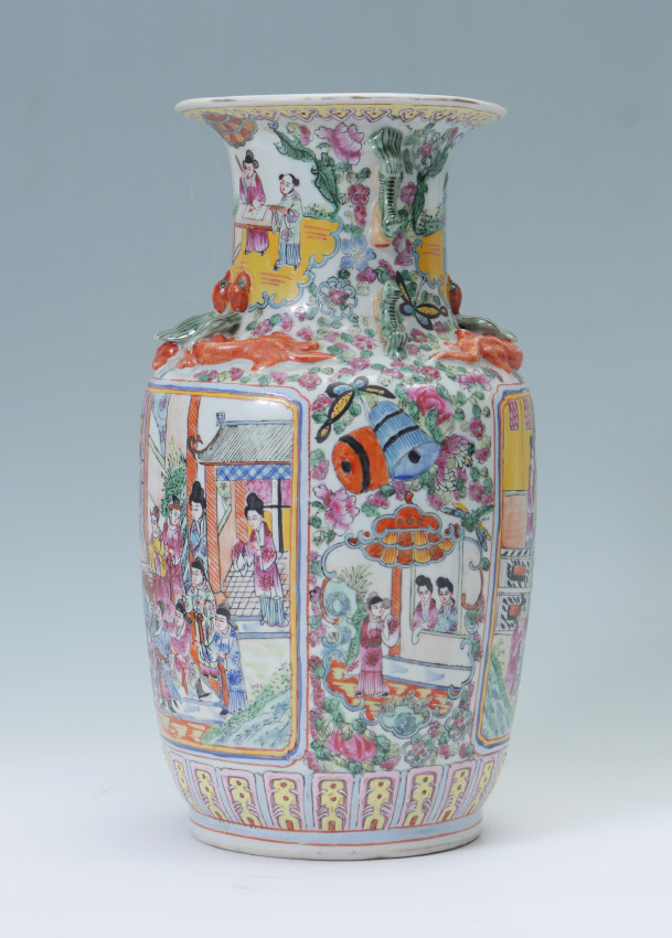 CHINESE EXPORT ROSE MEDALLION VASE: Incised and applied polychrome decoration, scenes of royalty and attendants in panels, spurious Jiaqing mark on base. Overall 14 3/8'' x 7 3/4''.