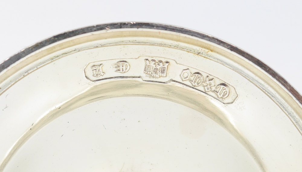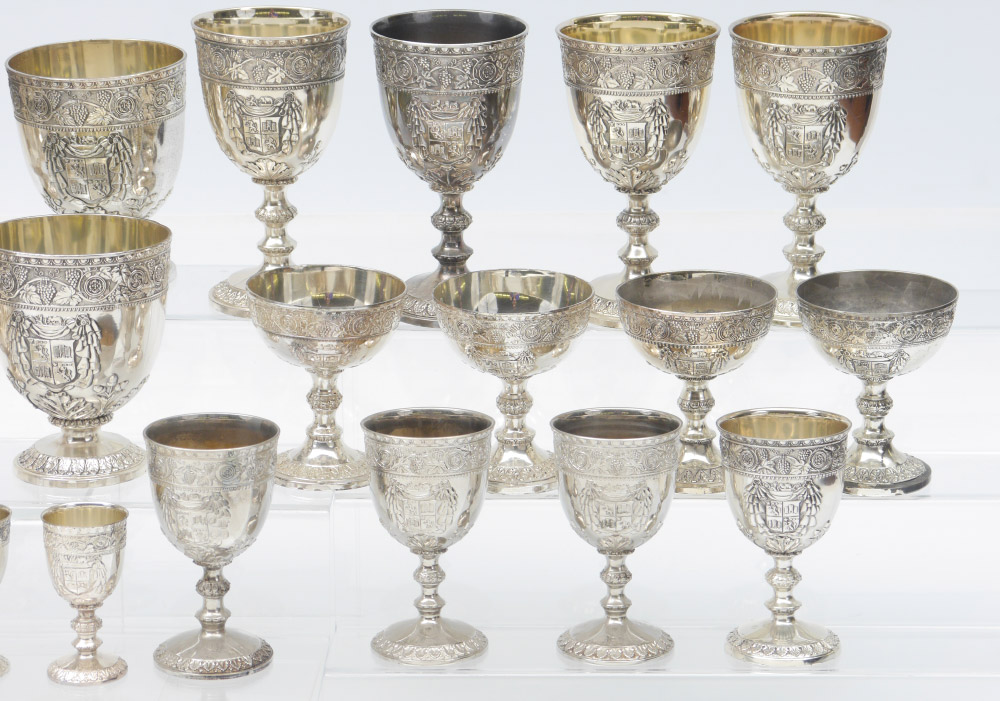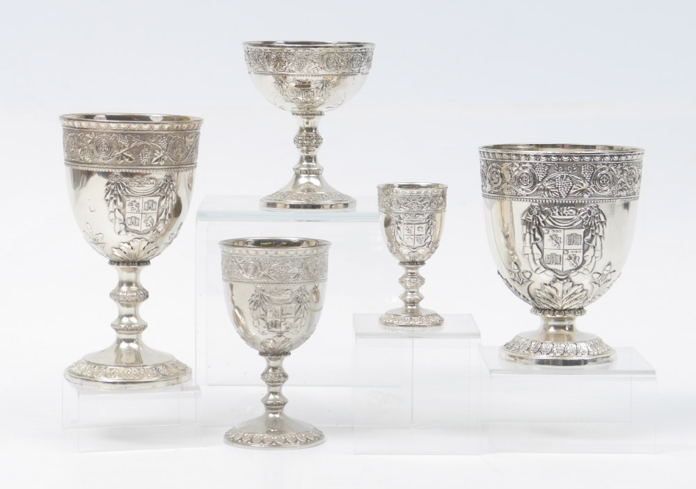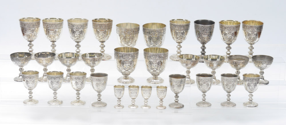LARGE ELKINGTON SILVERPLATE STEMWARE SET: Approx. 32 pieces by Elkington & Co. with grape vine motif rim, heraldic crest medallion, floral base, to include 8 goblets (6 1/2'' h.), 4 wide goblets (5 1/4'' h.), 8 wine (5''), 8 sherbets (4 1/4''), 4 cordials (3 1/4'').
