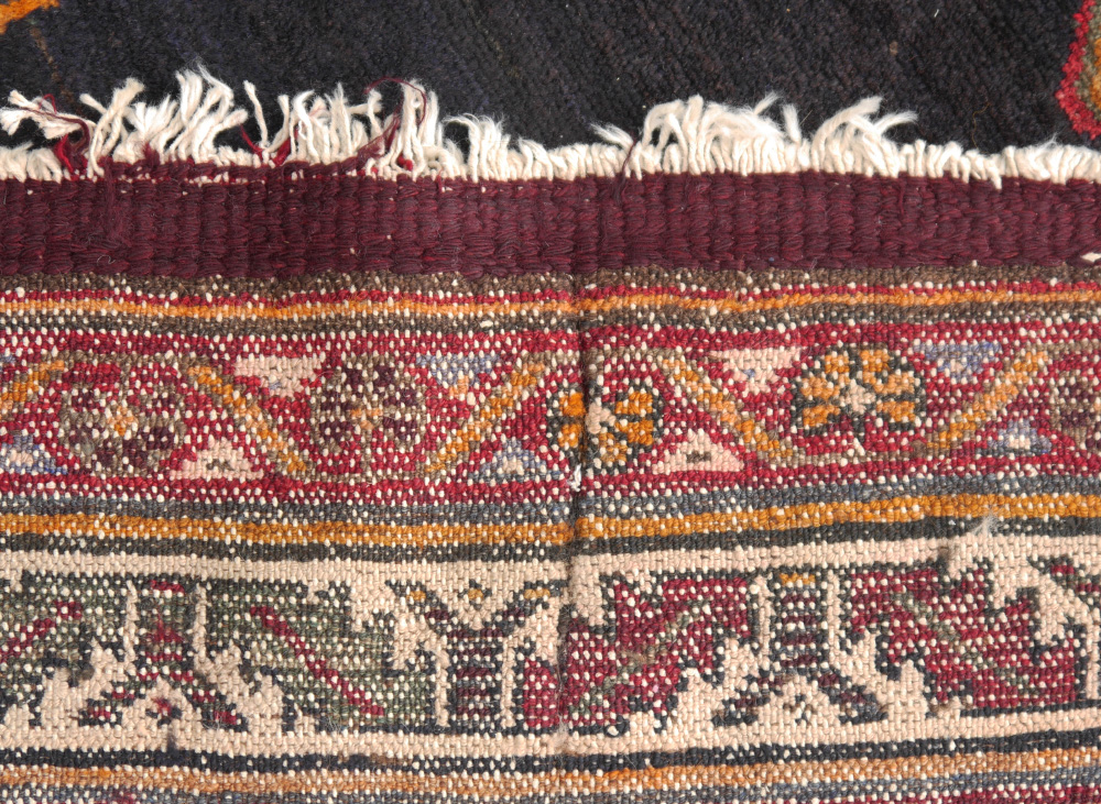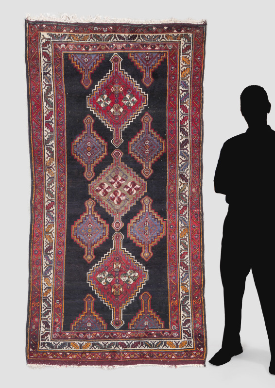 SEMI-ANTIQUE NW PERSIAN HAND KNOTTED WOOL RUG, 4'9'' x 7'8'': This rug has a somewhat unusual black background in the field that makes the design elements really stand out. There are three central serrated edge diamond shaped medallions that run down the center of the field. On either side are found smaller similar medallions. Each of the medallions have various colors and inner motifs. The most interesting are the pinwheel motifs found in the central medallions. They are, like the serrated leaf and wine glass border, found in Caucasian rugs. This may be a Kurdish rug because they often take elements from rugs woven by other neighboring weavers.
