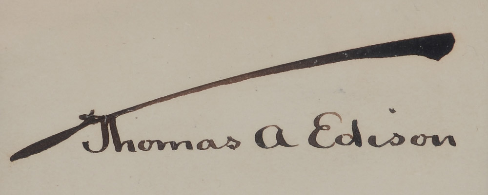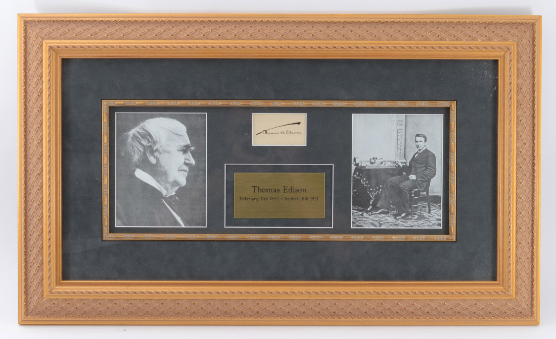 THOMAS EDISON FRAMED AUTOGRAPH: Clip signature, signed in ink pen, nicely framed and matted with 2 copies of photographs and brass plaque. Frame 17 1/4'' h. x 29'' x 1 1/4''.
