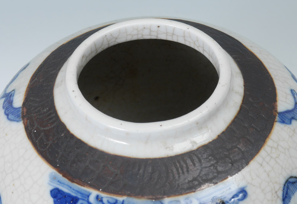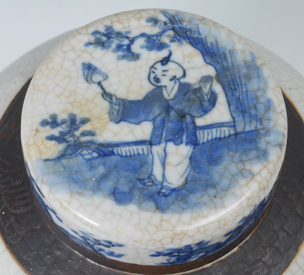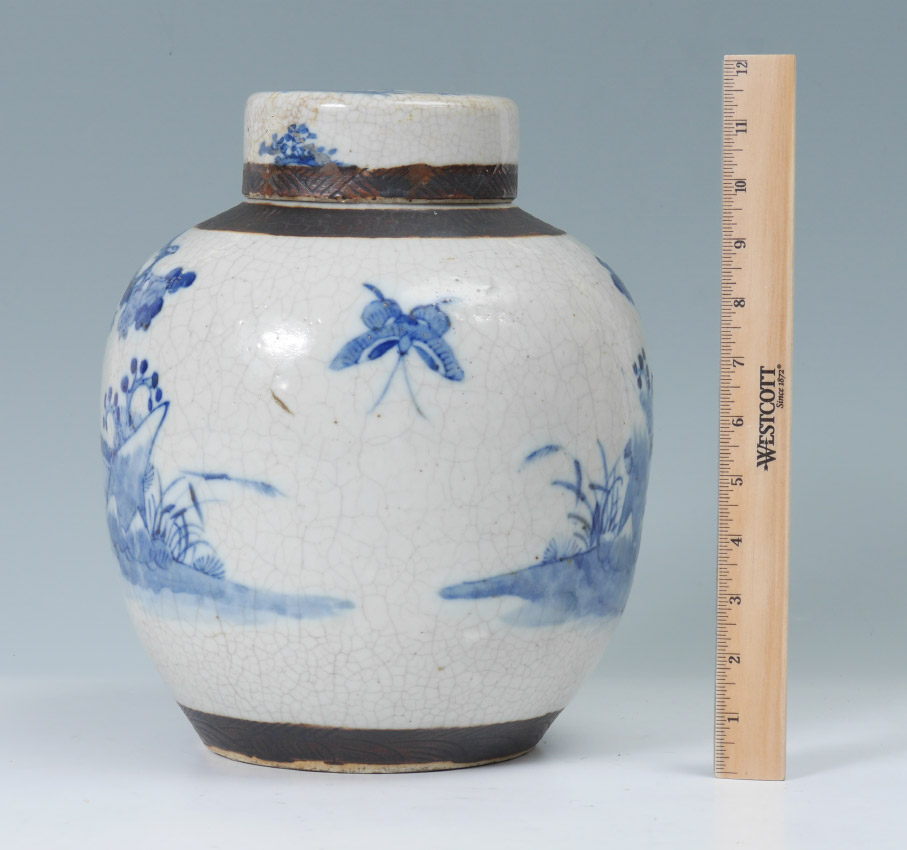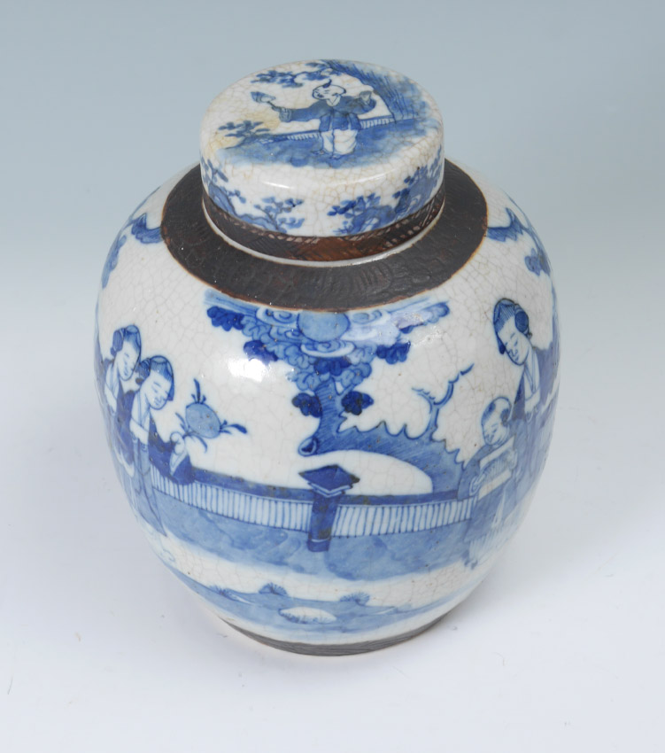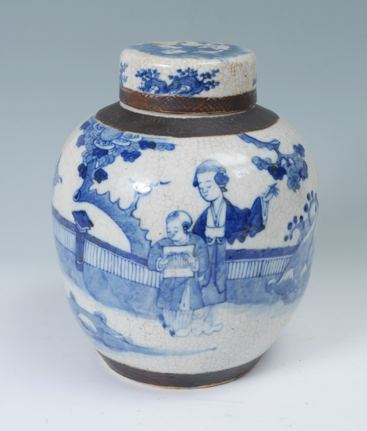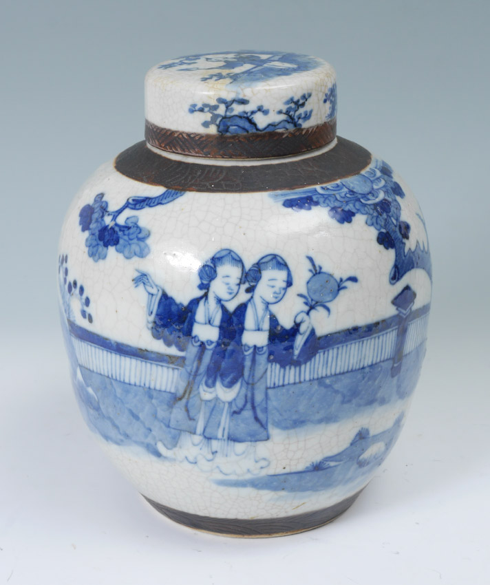 BLUE AND WHITE DECORATED CHINESE GINGER JAR: Lid with child holding fan on top and floral decoration. Body with brown incised bands, outdoor genre scenes with figures, spurious 4 character mark on base. Overall measures 11 3/4'' h. x 9 1/2''.