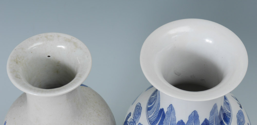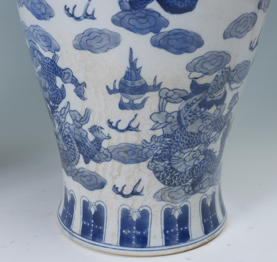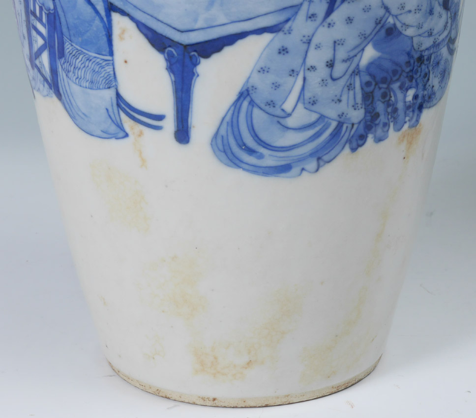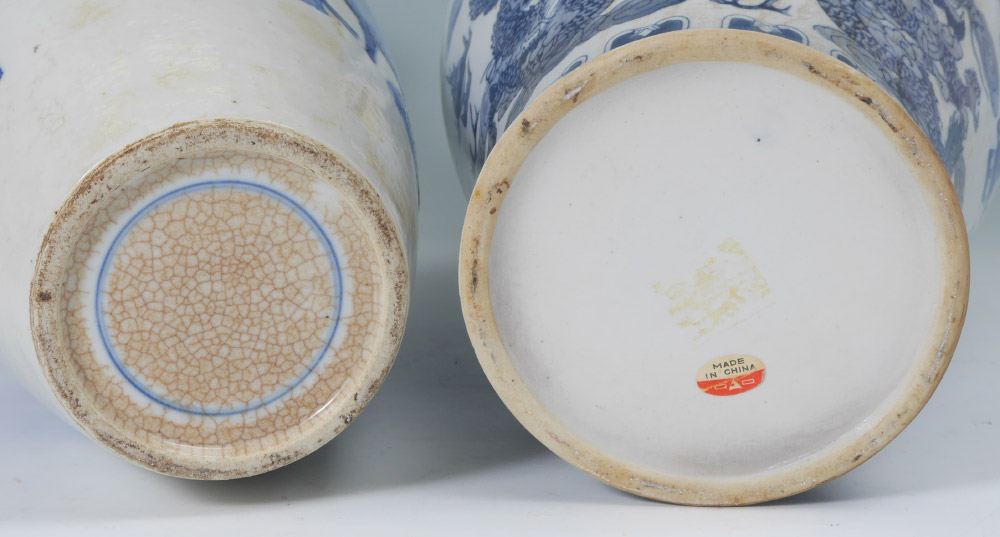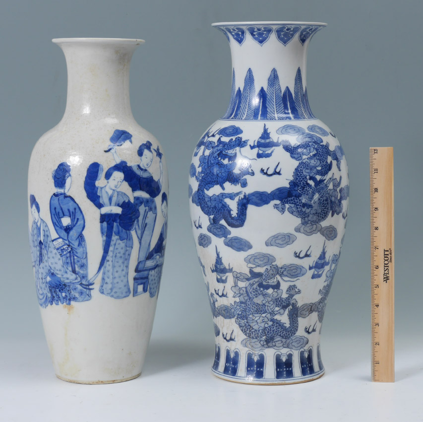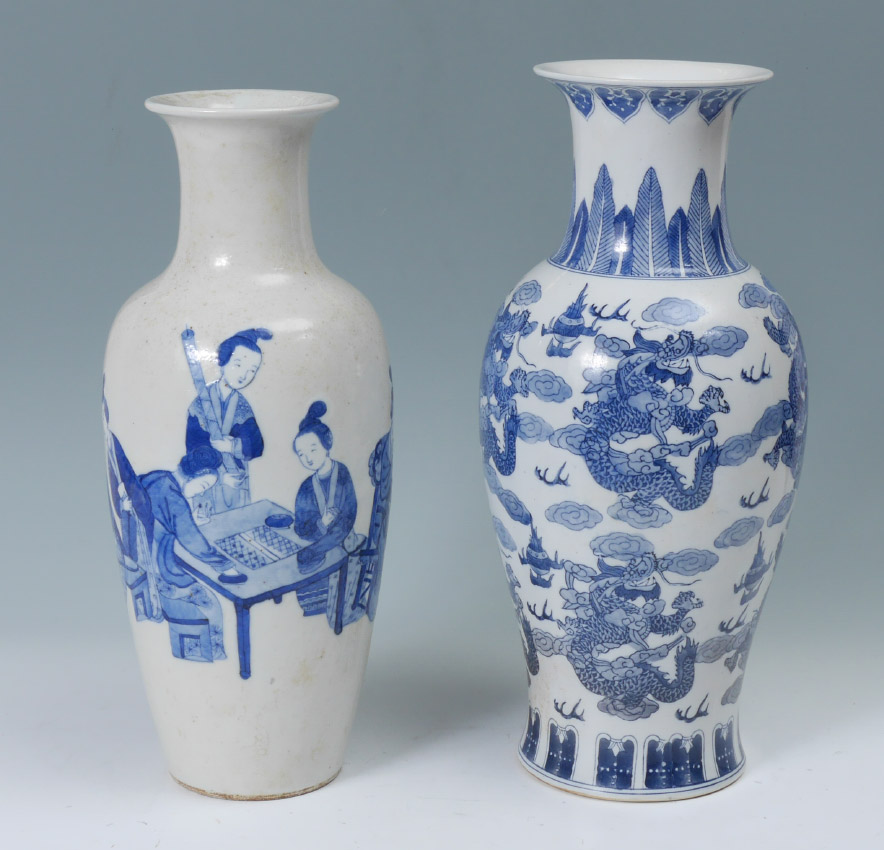 2 CHINESE BLUE & WHITE DECORATED VASES: 20th century, to include 1) Baluster form, repeating dragon in clouds motif body, Made in China sticker on base. 18 1/2'' x 8 1/4'' dia. 2) Baluster form, genre scenes of maidens playing games and instrument. Unmarked, 17 3/4'' h. x 7 1/2''.
