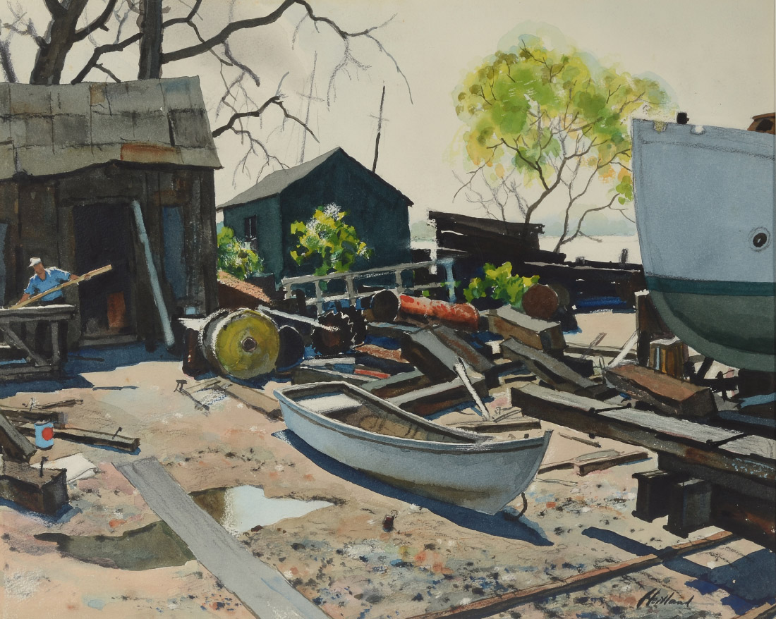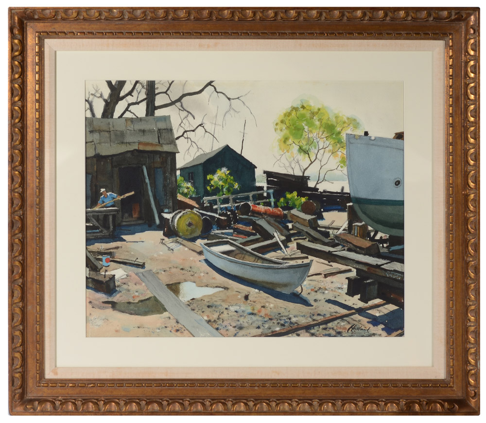 HEITLAND , Wilmot, (American, 1893-1969): Boatyard Scene with Worker, Watercolor, sight size 19 3/4'' x 24 3/4'', signed lower right, contemporary carved frame, 31 1/2'' x 36 1/2''.