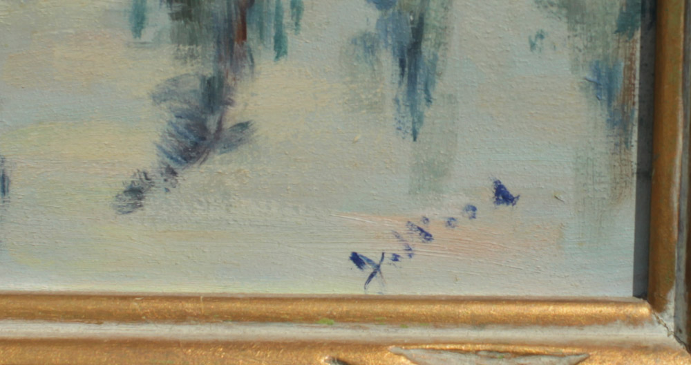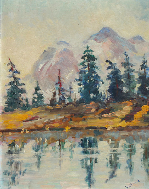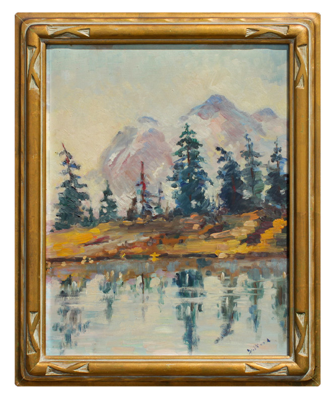 GOOD PAINTING OF LAKE LOUISE SIGNED WOOD: Oil/Masonite, sight size 20'' x 16'', signed lower right J. Wood, titled on the stretcher ''On the Way to Banff and Lake Louise'', hand carved period frame, 24'' x 19 1/2'', Allison Studio label affixed verso.