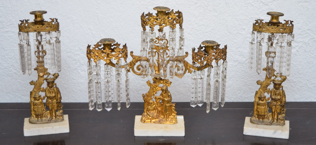 3 PIECE GILT METAL GIRONDAL SET: An assembled 3 piece set to include 1) 3 light with figural mother & child with lamb, marble base, 15 1/4'' h. x 17'' x 4''. 2-3) Pair single light with figural soldier & child, marble base, 14 3/4'' h. x 5 1/2'' x 3 1/4''.