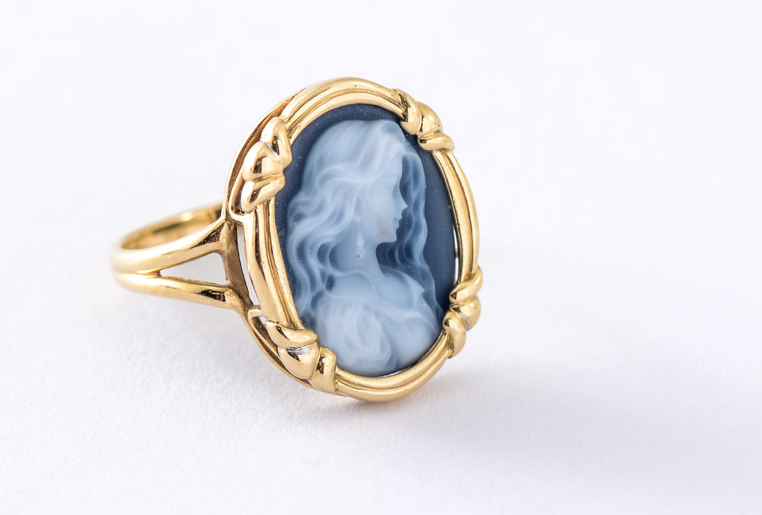 18K PORCELAIN JASPERWARE PORTRAIT RING: Art Nouveau 18K yellow gold ring centering a bezel set porcelain image of a young woman, nicely detailed down to her dangling earrings. Size 8. Weight 4.3 grams.
