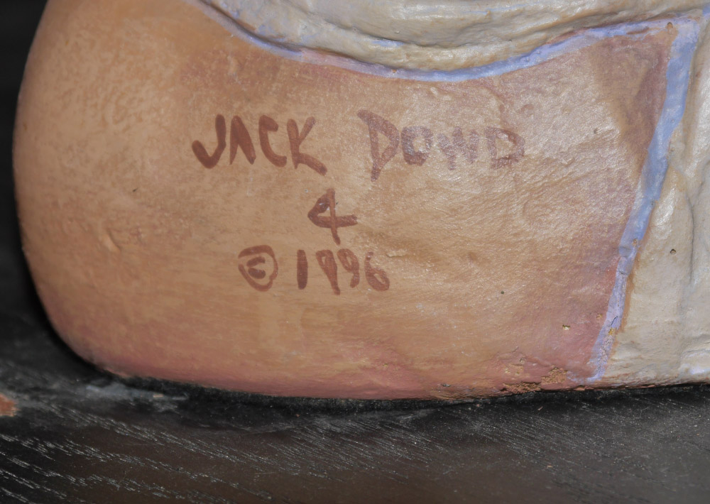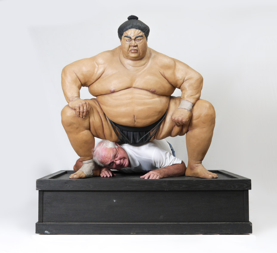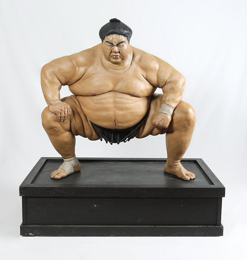 DOWD, Jack, (American, 1938- ): Sumo Wrestler, Artist Proof Cast and Painted Gypsum Cement, the wrestler measures 42'' h. x 41'' w. x 26'' d., sits on a custom painted oak platform, overall measurements 55 1/2'' h. x 52'' w. x 30'' d., signed on the base and dated 1996.