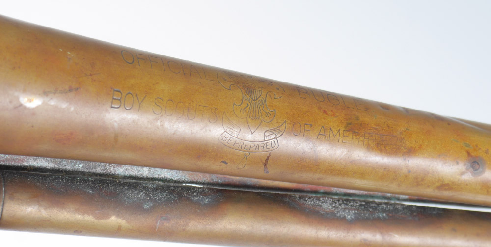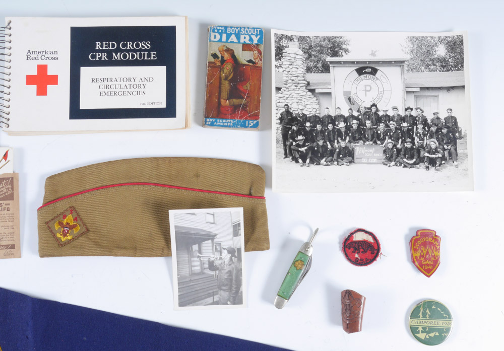 COLLECTION OF 1940'S BOY SCOUT MEMORABILIA: Entire collection from one person to include Honor Patrol felt pennant, official brass bugle, 1939 Camporee pinback, 1941 Scoutorama leather arrow, hat, photograph of Scout Troop at Philmont Scout Ranch and more. Also included is a 1980 Red Cross CPR Module book.