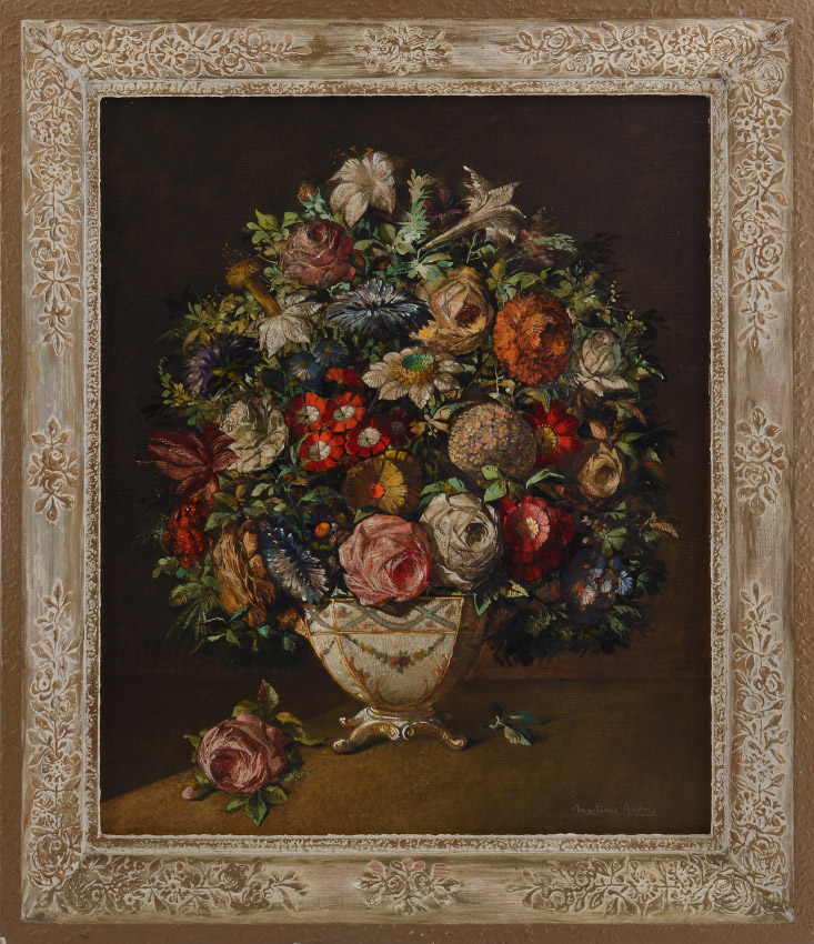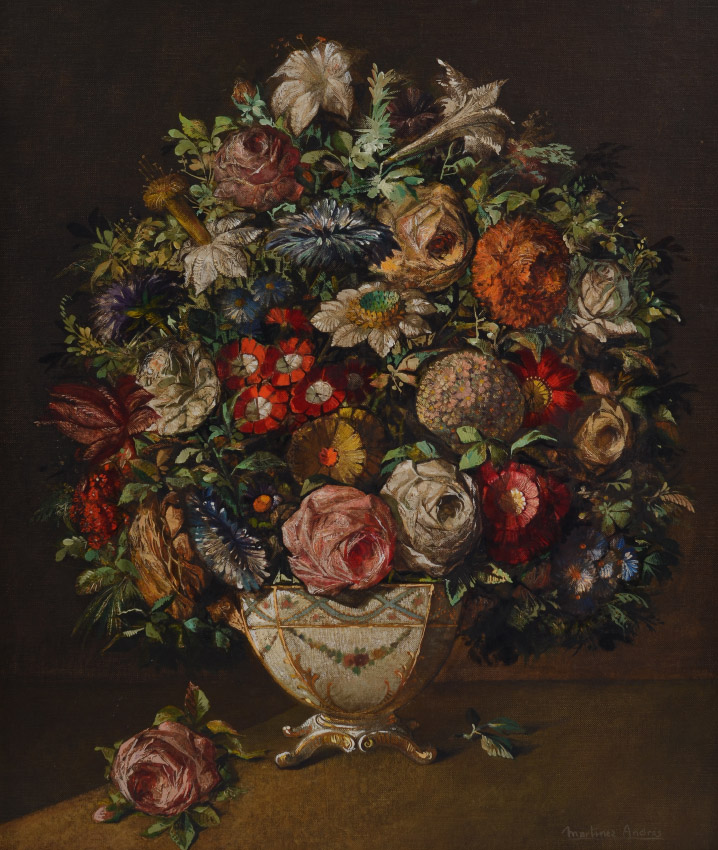 ANDRES, Martinez, (American, 20th Century): Elaborate Floral Still Life with Robust Bouquet in a Porcelain Comport, Oil/Canvas Board, sight size 24'' x 19 3/4'', signed lower right, framed, 29 1/2'' x 25 1/2''.