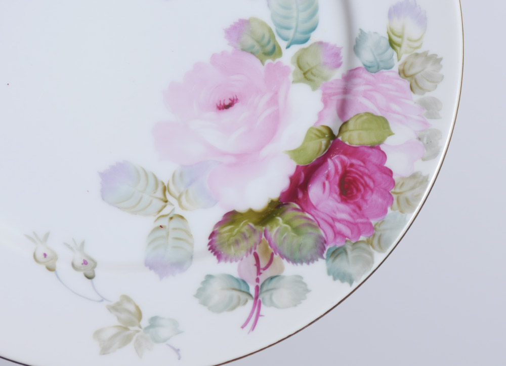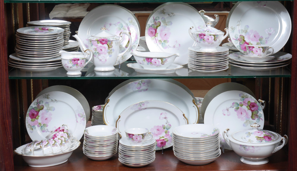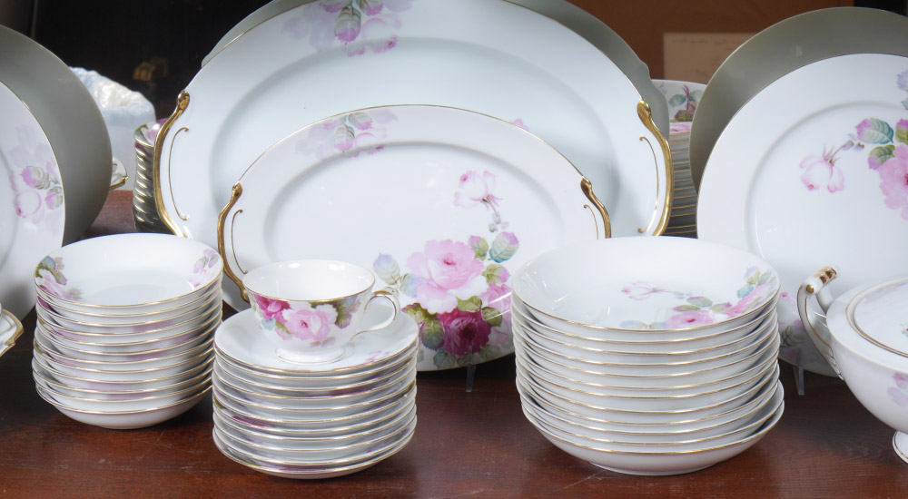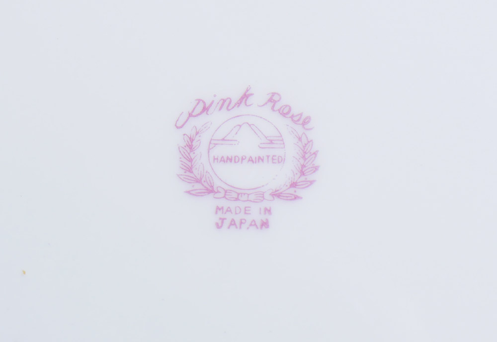 HAND PAINTED NORITAKE PINK ROSE CHINA: Approx. 92 pieces in the ''Pink Rose'' pattern by Noritake to include 12 dinner plates (10''), 12 salad plates (7 1/2''), 12 bread plates (6 1/2''), 12 dessert bowls (5 1/2''), 12 soup bowls (7 1/2''), 12 cups (1 with chip), 12 saucers, creamer, covered sugar, coffee pot, 12'' platter, 16'' platter, open vegetable bowl (has chip), covered vegetable, and the gravy boat. Made in Japan.