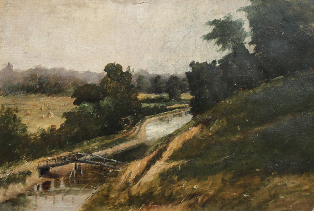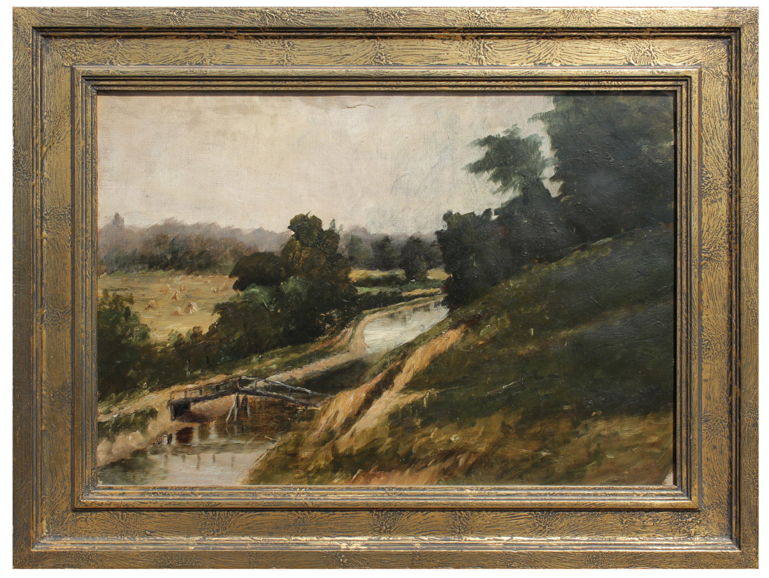 TURN OF THE CENTURY AMERICAN SCHOOL COUNTRY LANDSCAPE PAINTING: Oil/Canvas, sight size 12 1/2'' x 17 3/4'', no visible signature, encased in painted frame, 17'' x 22 1/2''.