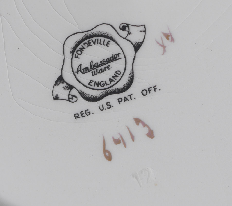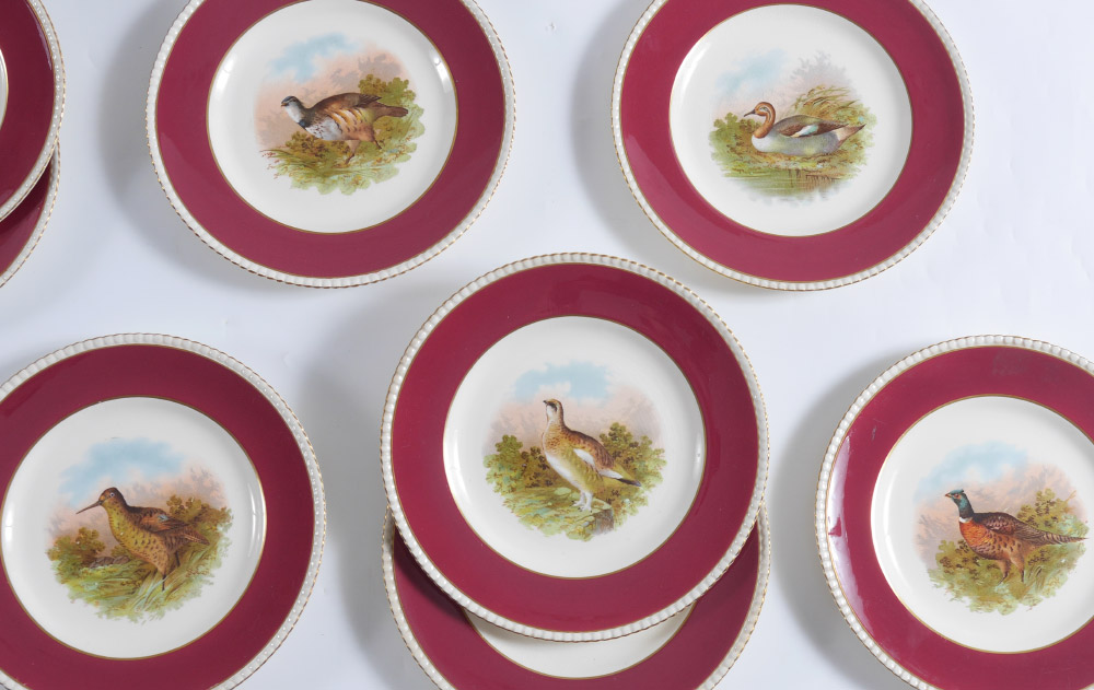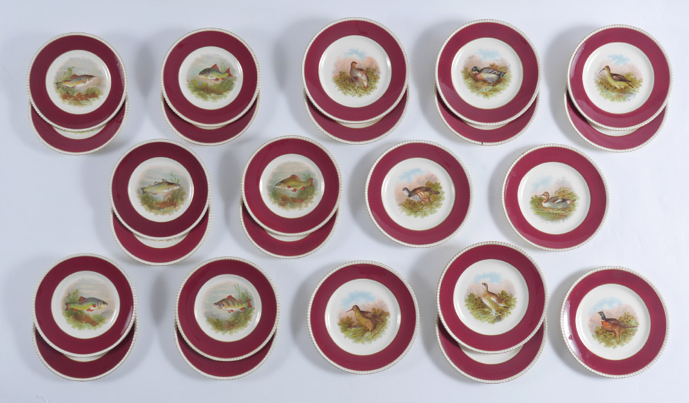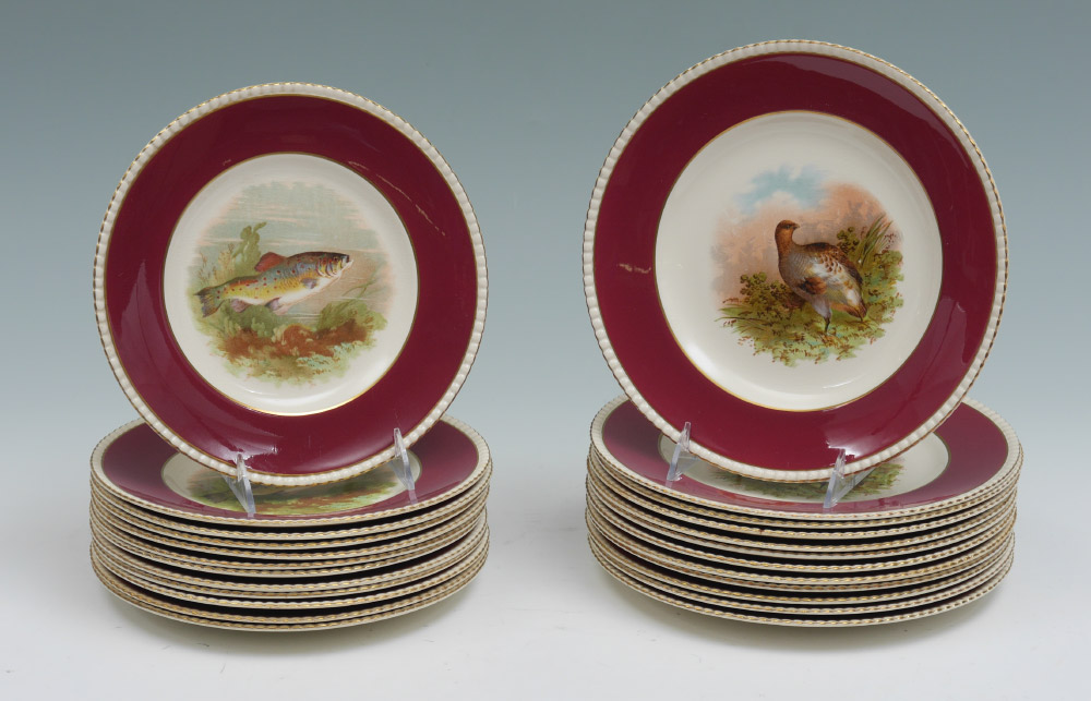 2 SETS OF ENGLISH FONDEVILLE GAME PLATES: Ambassador Ware, each centering the image of a game bird or fish. There are 12 bird plates, 9 3/4'', and 12 fish plates, 8 3/4'' dia.