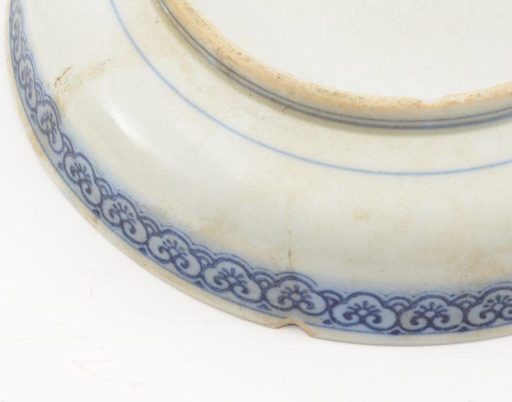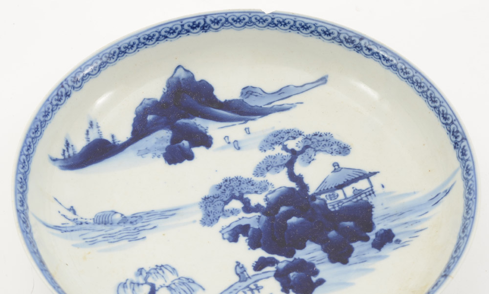 3 CHINESE BLUE & WHITE DECORATED LOW BOWLS: 3 with matching genre scene of elder on bridge, temple, ship and mountain center with floral border. Unmarked. 2 1/4'' h. x 9 3/4''.