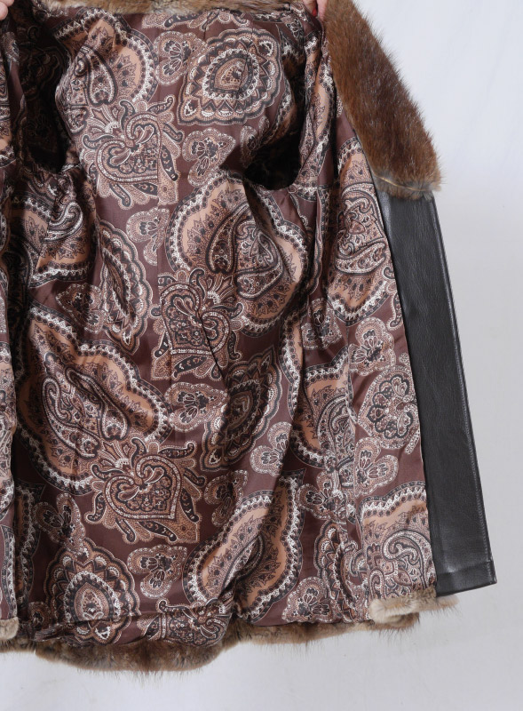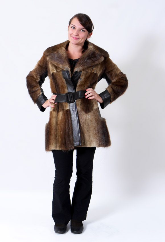 RETRO FUR AND LEATHER JACKET: Car coat length with fur pelts, leather panels and leather belt. Size smell to medium measures approx. 30'' collar to hem, 18'' shoulder to shoulder and 19'' shoulder to cuff.