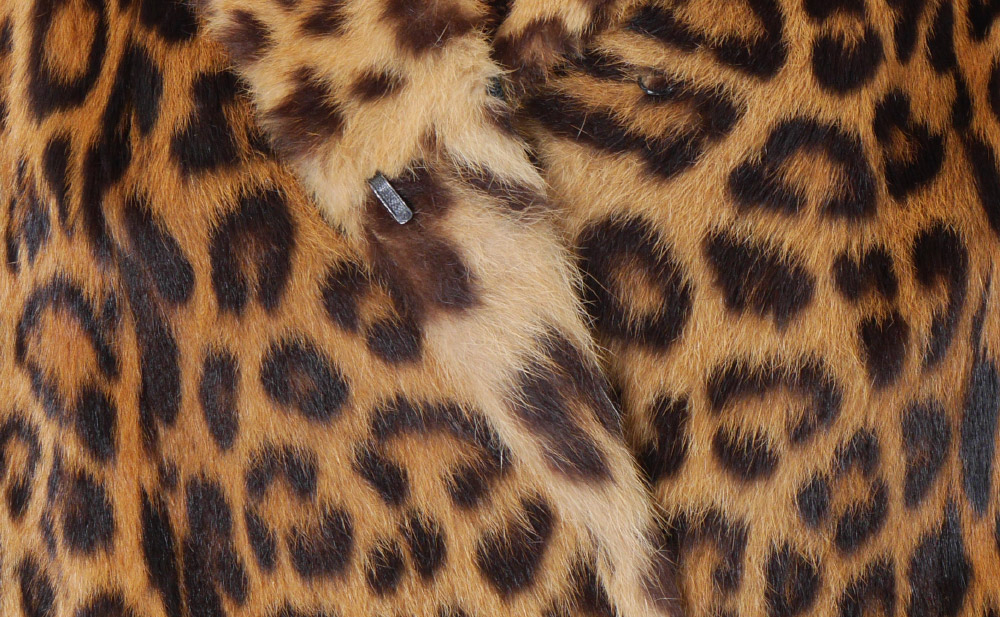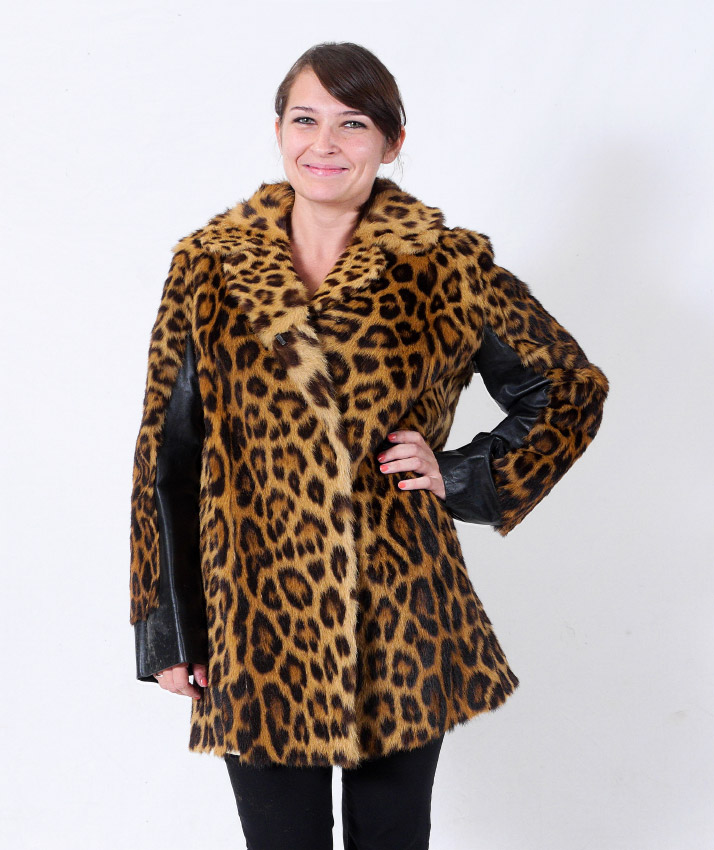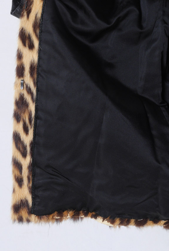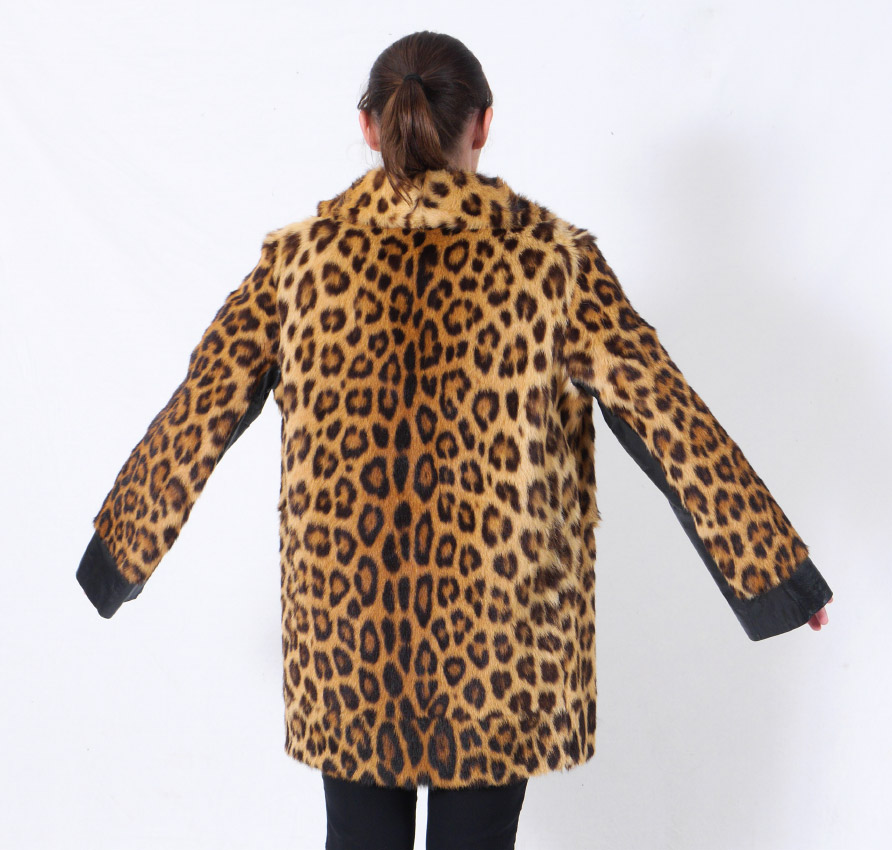 VINTAGE LEOPARD FUR JACKET: K Borowski Johannesburg label. Car coat length with black leather strip the interior length of the arms. Small to medium size measures approx. 31'' collar to hem, 16'' shoulder to shoulder and 23'' shoulder to cuff.