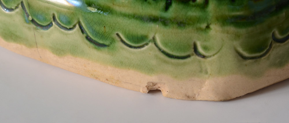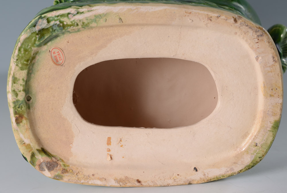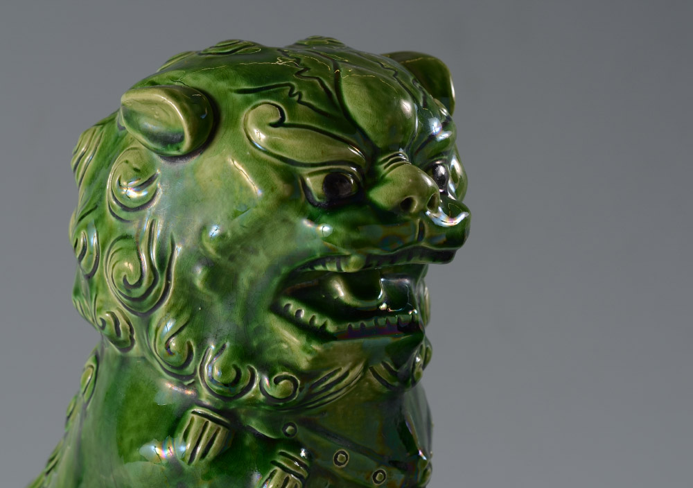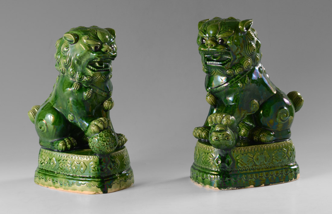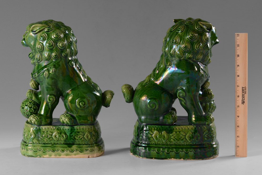 PAIR GREEN GLAZE CERAMIC FOO DOGS: 20th century, mottled green glaze male and female foo dogs, impressed mark on base. Overall measures 13 3/4'' h. x 7'' x 9''.