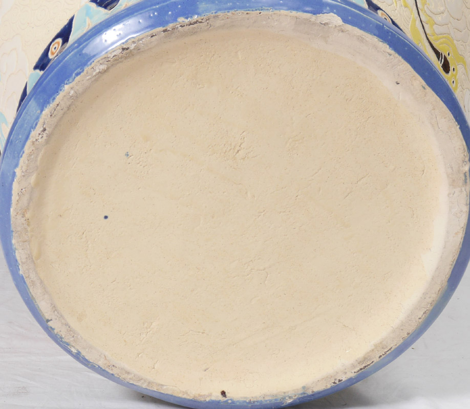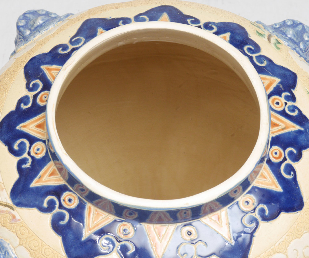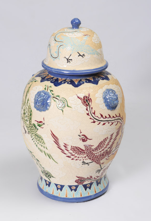 LARGE DECORATIVE COVERED TEMPLE JARS: Incised & polychrome birds in clouds motif decoration with figural handles. Overall 33 3/4'' h. x 21''.