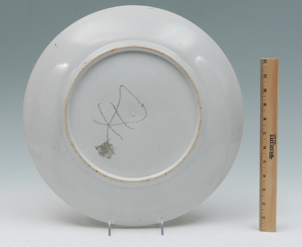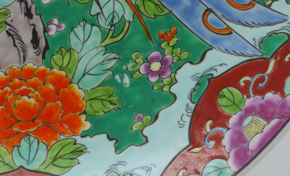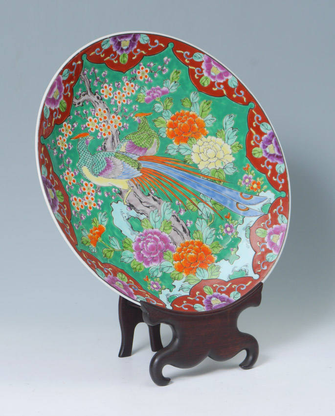 VIBRANT CHINESE PEACOCK CHARGER: Bright incised polychrome decorated charger with peacock or birds of paradise and floral decoration. Unmarked, 2 1/4'' h. x 16'' dia. Sold with a wood stand, 12 1/2'' h. x 8'' x 6 1/2''.