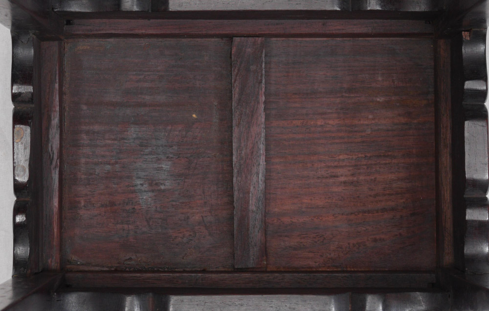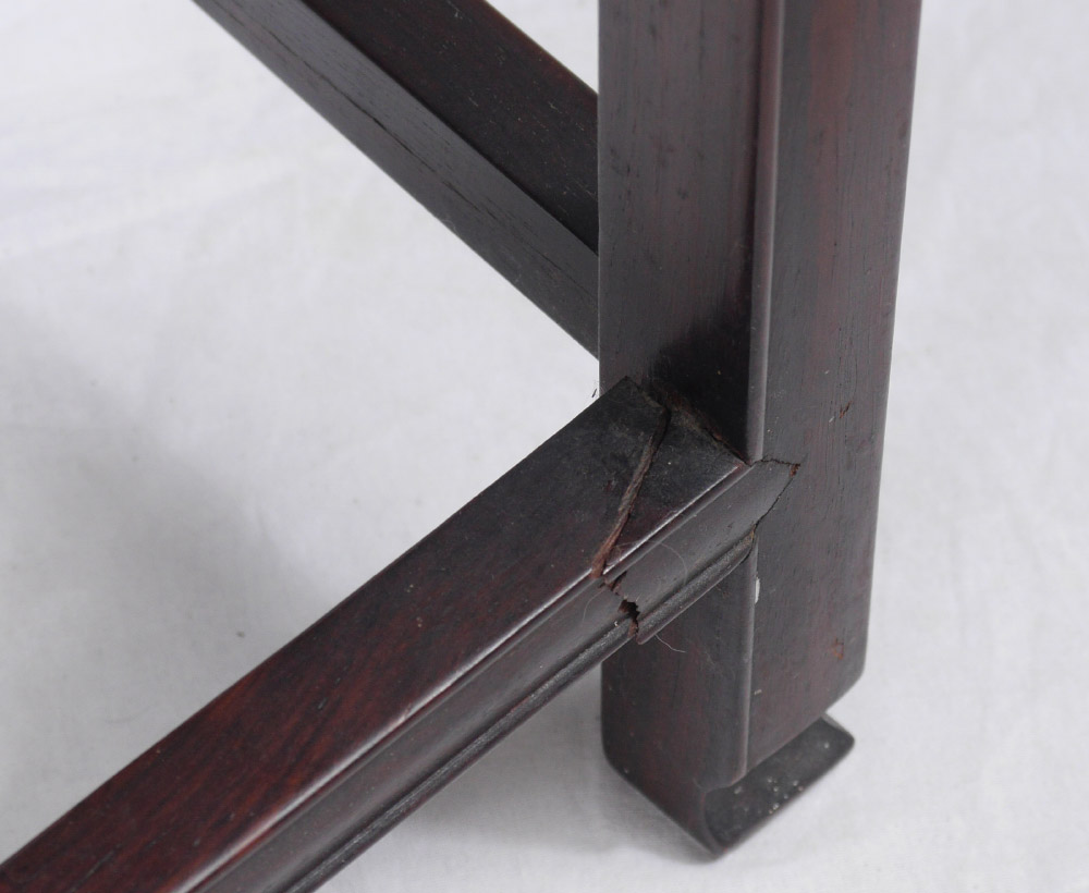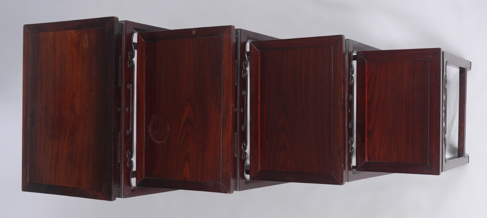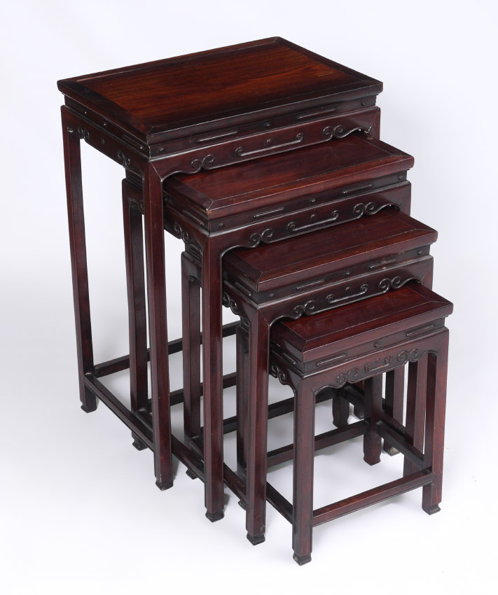CHINESE CARVED ROSEWOOD NEST OF 4 TABLES: 4 graduating nest of stacking tables, rectangular tops, carved and shaped aprons, straight legs and stretchers. Tallest measures 27 3/4'' h. x 19'' x 13 3/4'', smallest 16 3/4'' x 12'' x 8 1/4''.