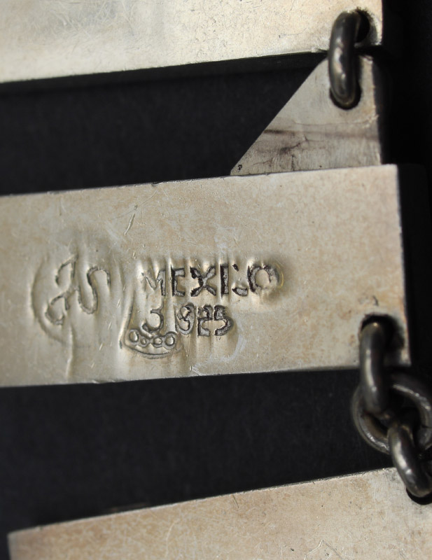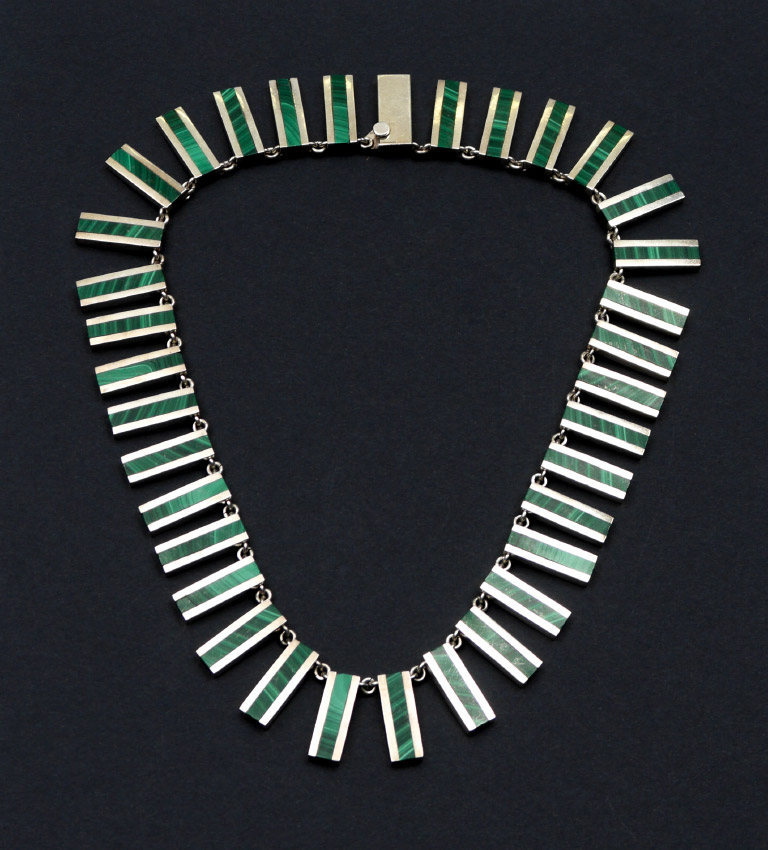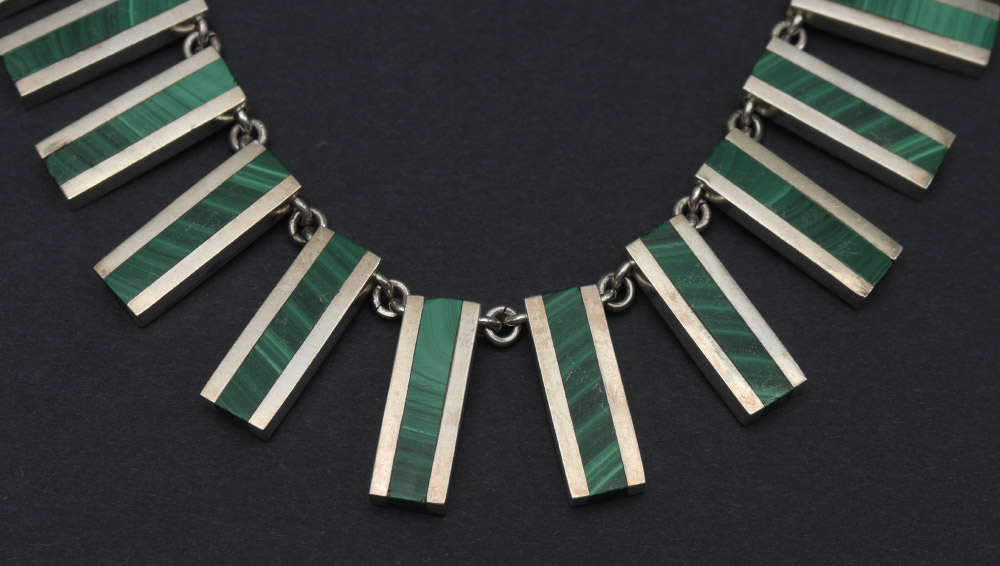 MEXICAN STERLING & MALACHITE NECKLACE: Sterling bar drops with inset bands of malachite, unknown maker stamp JS? in circle. Measures 15 1/2'' long, approx. 3.6 troy oz. inclusive of stones.