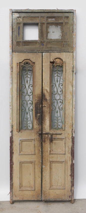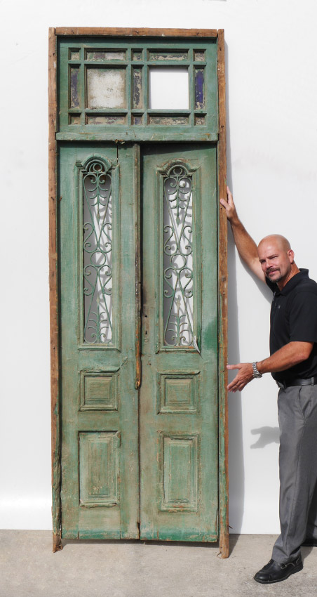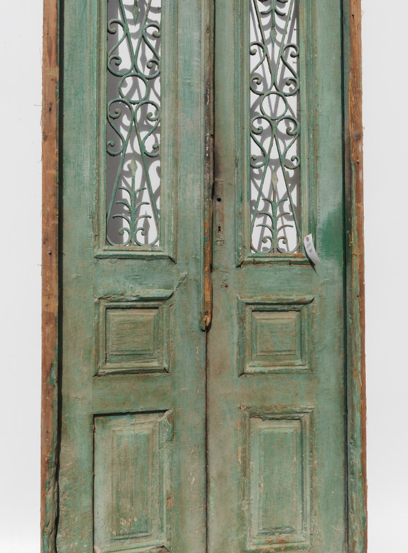 PAIR GREEN PAINTED ARCHITECTURAL DOORS: Framed, approx. 113'' h. x 38 1/4'' x 3 1/2''