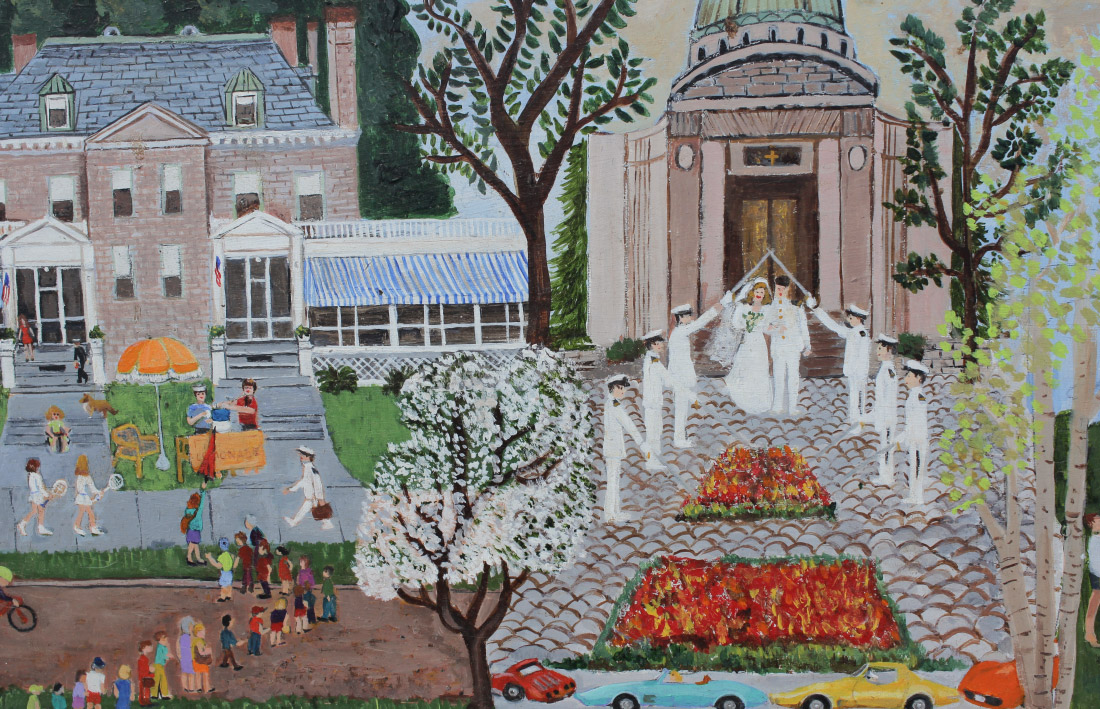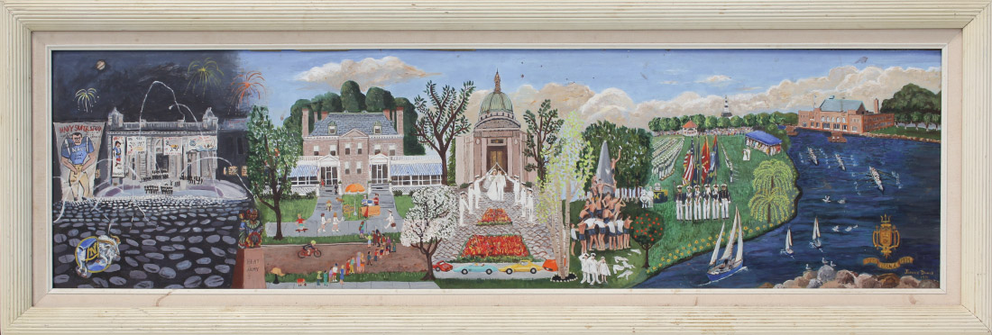 LARGE ANNAPOLIS NAVAL WEDDING FOLK ART PAINTING: Oil/Masonite by Jeanne Danis, 13'' x 48'', signed lower right and dated 1991, framed, 19'' x 54''.